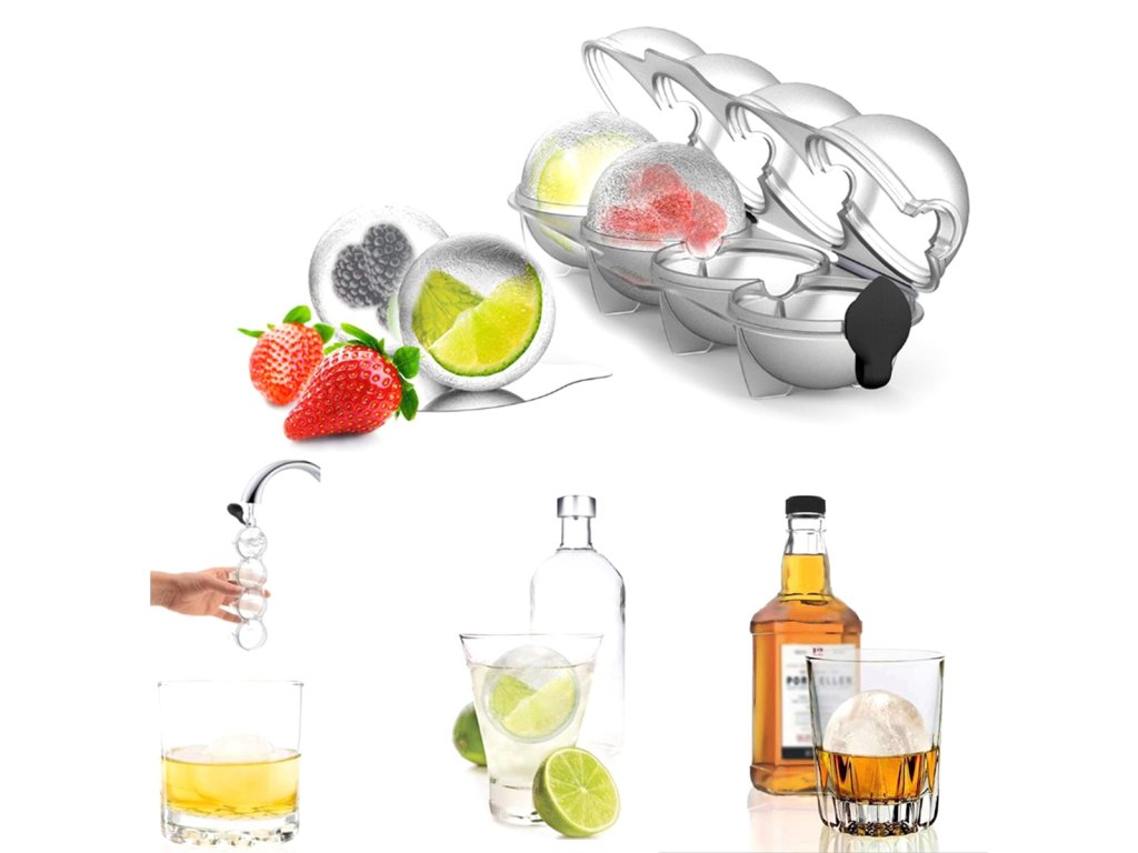 Sada 4 průhledných kuliček uzavřených v jedné formě. Ideální pro vytváření efektních ledových kuliček. Těsný silikonový uzávěr usnadňuje plnění kuliček vodou a zvyšuje jejich těsnost při skladování v mrazáku. Jedná se o skvělý kuchyňský a párty gadget, který ochladí a ozdobí vaše nápoje a nápoje.