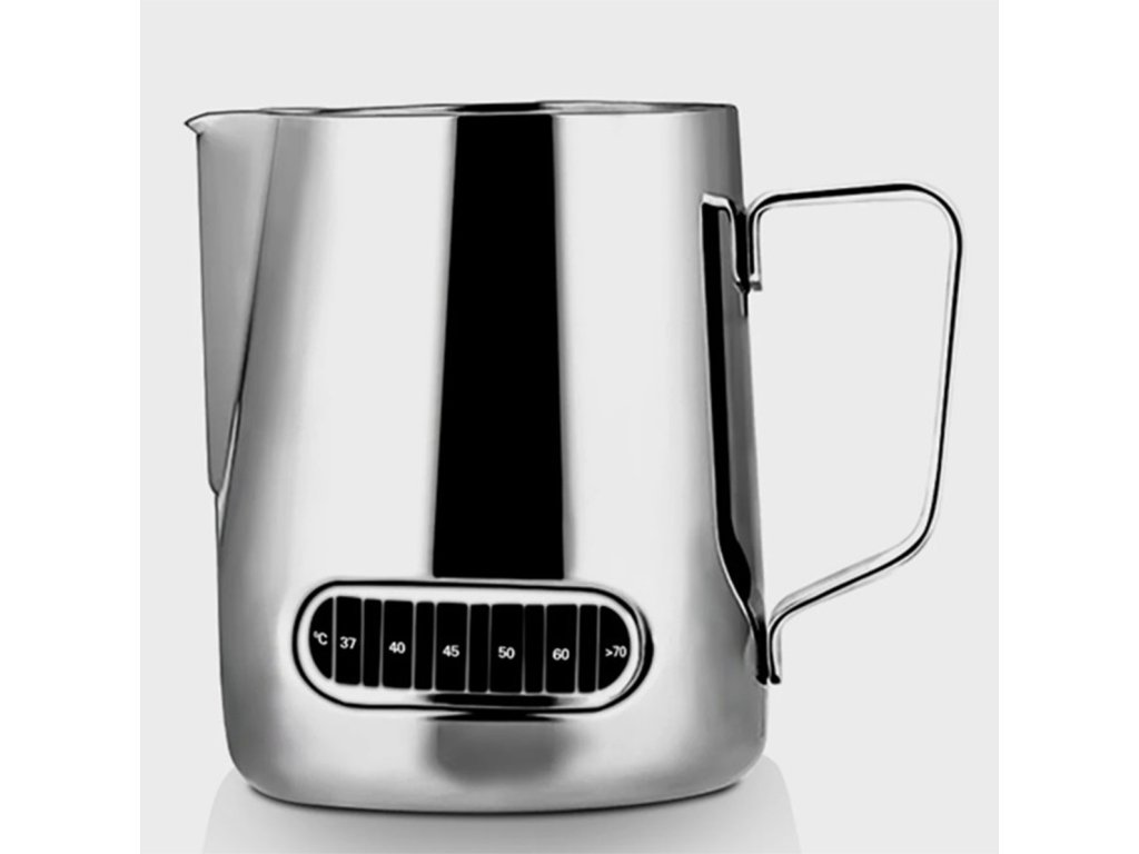 Praktická ocelová konvička (konvička na mléko) na napěnění mléka. Pohodlná rukojeť a hubice usnadňují nalévání. Praktická odměrka uvnitř hrníčku s dělením 50 ml. Vybaveno teploměrem, který usnadňuje kontrolu teploty mléka. Pevná ocelová konstrukce zajišťuje dlouhé a bezproblémové používání.