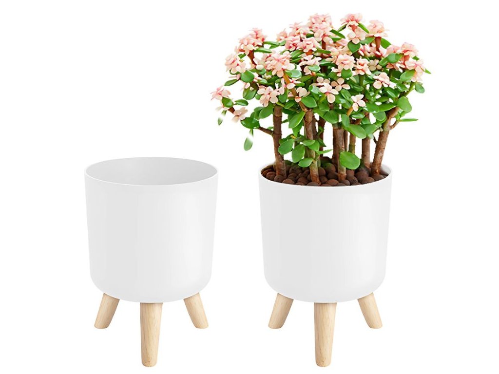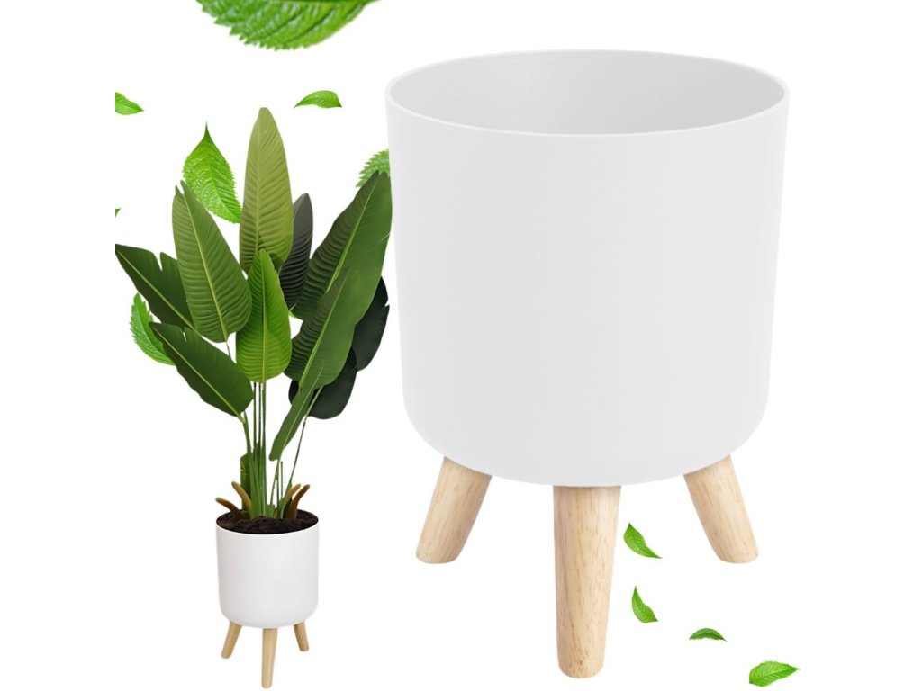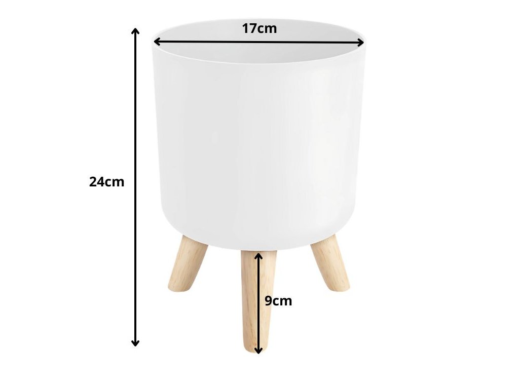 Květináč je vyroben z lehkého, ale pevného plastu, který se snadno udržuje v čistotě. Dřevěné nohy zaručují stabilitu a dodávají květináči přírodní charakter. Celkový vzhled je elegantní a harmonický - dokonalá kombinace jednoduchosti a stylu.