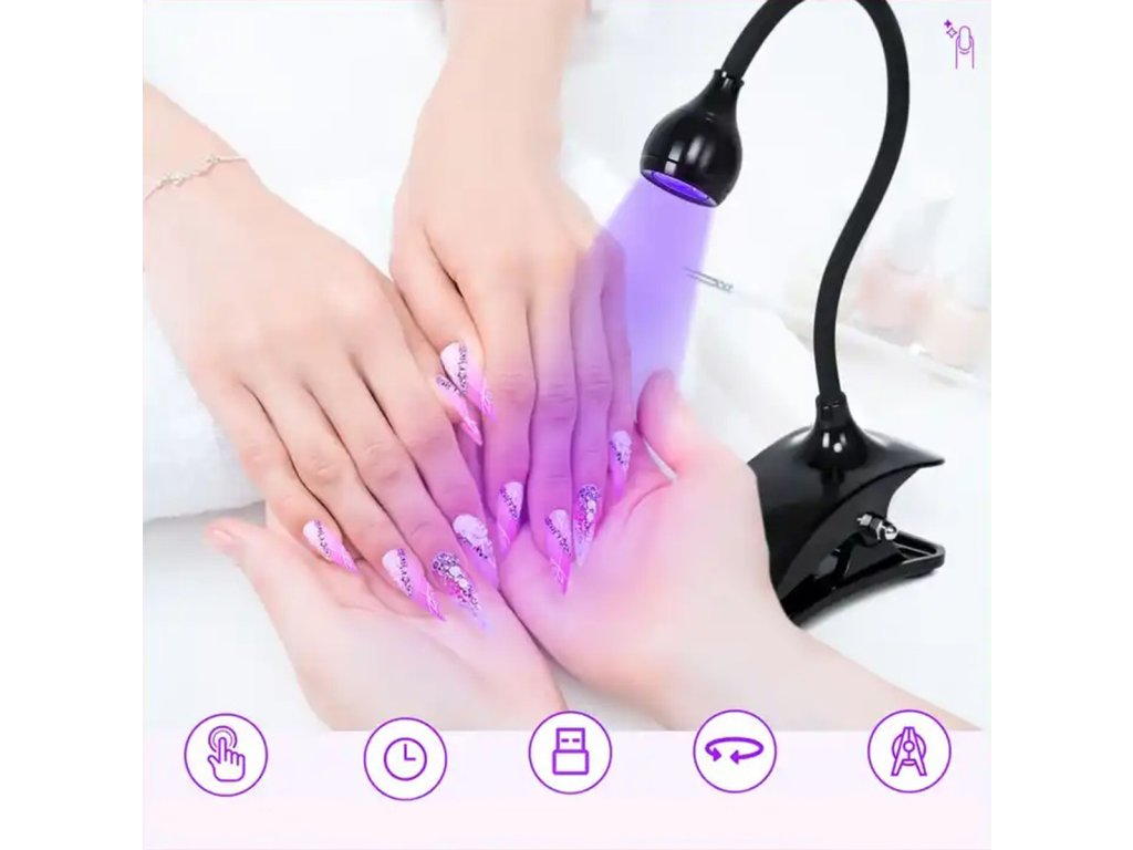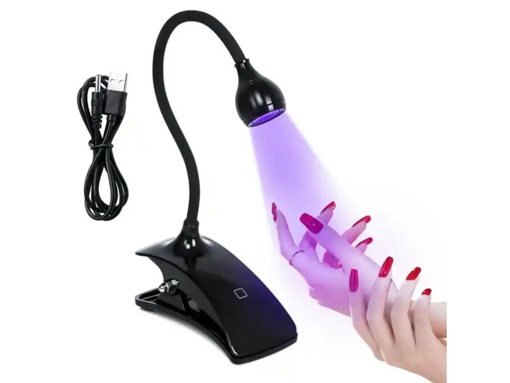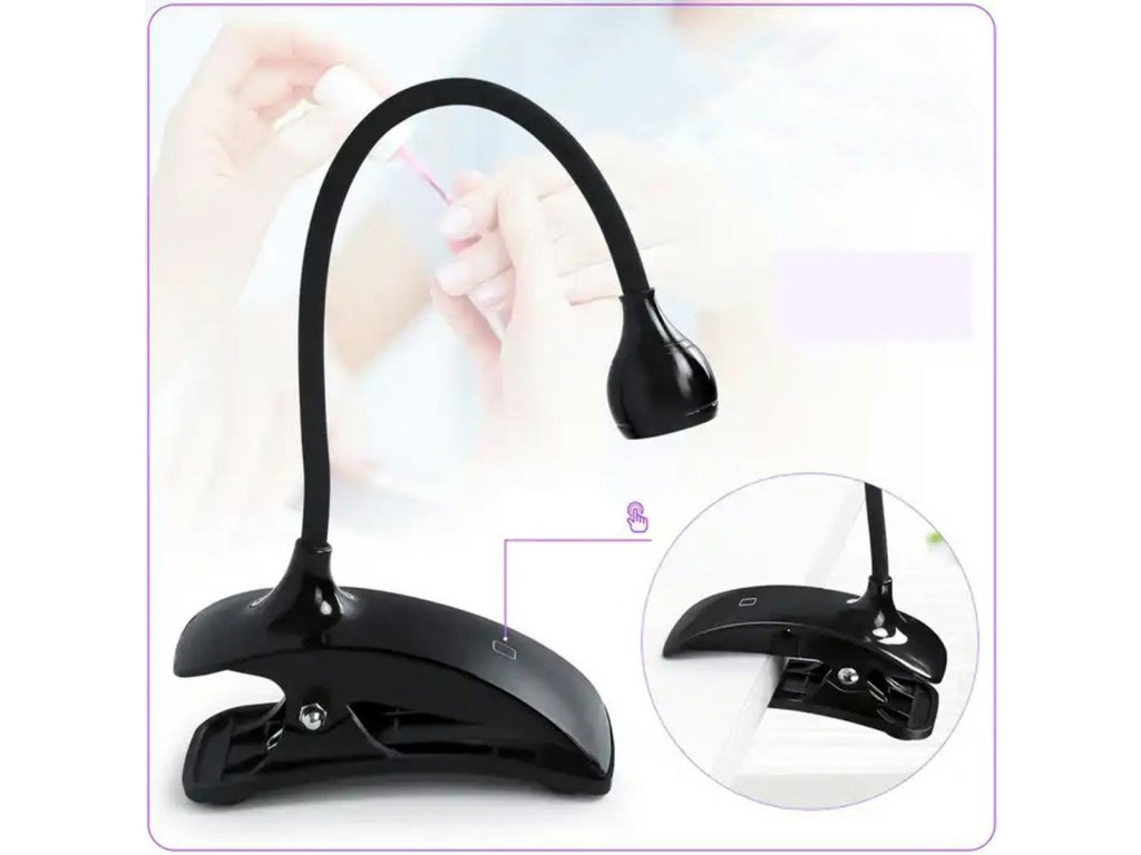 Kompaktní 3W UV LED lampa s flexibilním designem, upevněná na klipu. Je pohodlná a velmi snadno se používá. Lampa je ideální pro samostatnou aplikaci akrylových nebo gelových nehtů, také dokonale zpevňuje nehty a zabraňuje lámání jejich nehtové ploténky. Je velmi lehká a praktická. Vhodná pro použití se všemi přípravky pro vytvrzování světlem. Skvěle jednoduché a komplexní řešení pro péči o nehty. Určeno pro zpevnění jednoho nehtu.