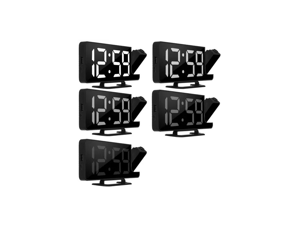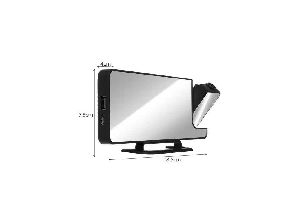 - SPECIFIKACE - materiál: ABS; barva: černá; barva displeje projektoru: červená; barva displeje hodin: bílá; formát zobrazení času: 12h; podsvícení: LED; nerozbitné zrcadlo: ano; rozměry: 18,5 x 7,5 x 4 cm; hmotnost: 0,144kg; hmotnost v balení: 0,238 kg.