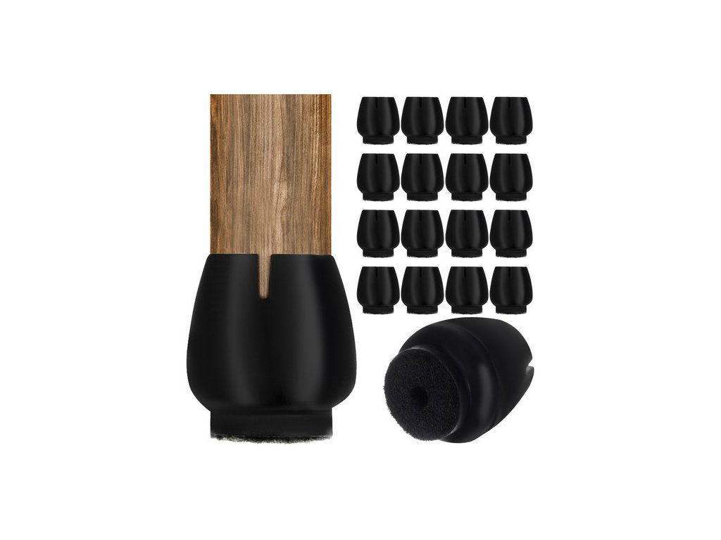 - SPECIFIKACE - množství: 16 kusů; barva: černá; pro nohy židle o průměru: 12-16 mm; materiál: silikon + plsť; rozměry: 23mm – 25mm; hmotnost jednoho kusu 3g; hmotnost sady: 67 g; hmotnost v balení: 68g; materiál: PVC, plsť