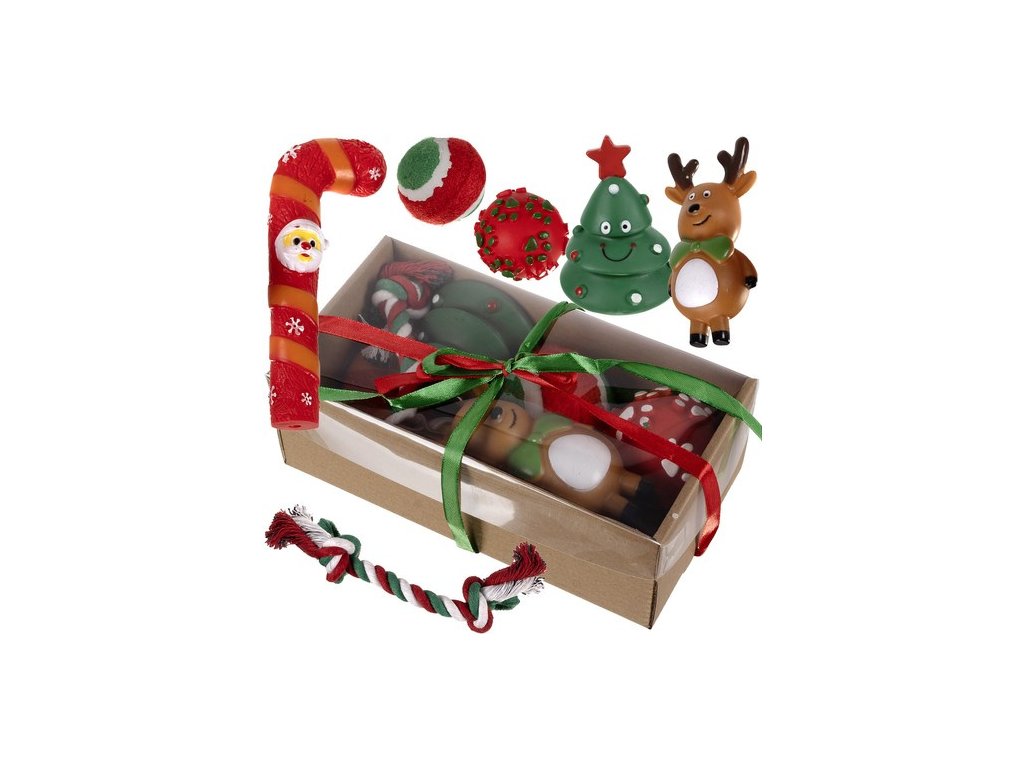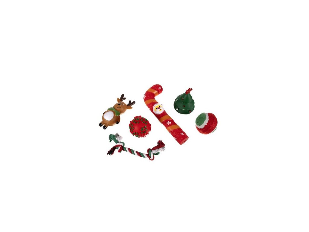 - VELKÁ SADA – má až 6 hraček pro vašeho mazlíčka, jako jsou: tenisový míček, pletené lano a 4 gumové a pískací hračky, které Jsou s vánoční tématikou.