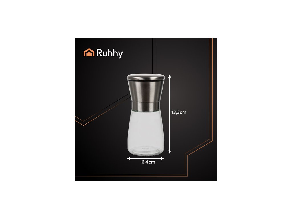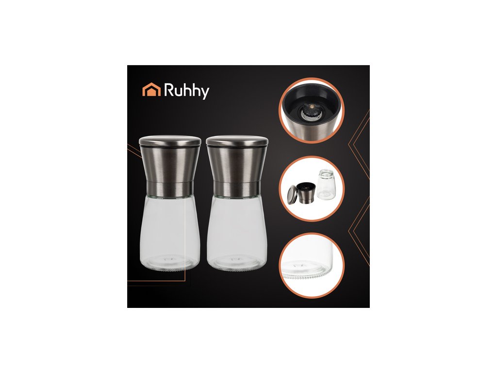 Zvolte styl a funkčnost s moderními mlýnky RUHHY. Vyrobeno z průhledné sklo a zakončené kovovým víkem, které vám umožní kontrolovat množství koření a zároveň vypadají elegantně v každé kuchyni. Keramický mlecí mechanismus zajišťuje přesné ruční mletí a uvolňuje plnou chuť každého pokrmu. Tato praktická a stylová sada je ideální jak pro každodenní vaření, tak pro elegantní prostírání – protože skutečná chuť začíná čerstvě mletým kořením.