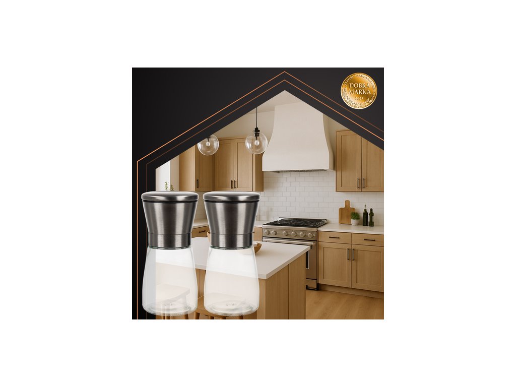 - sada 2 skleněných mlýnků s keramickým mechanismem – odolné, estetické a přesné, ideální pro sůl, pepř a bylinky