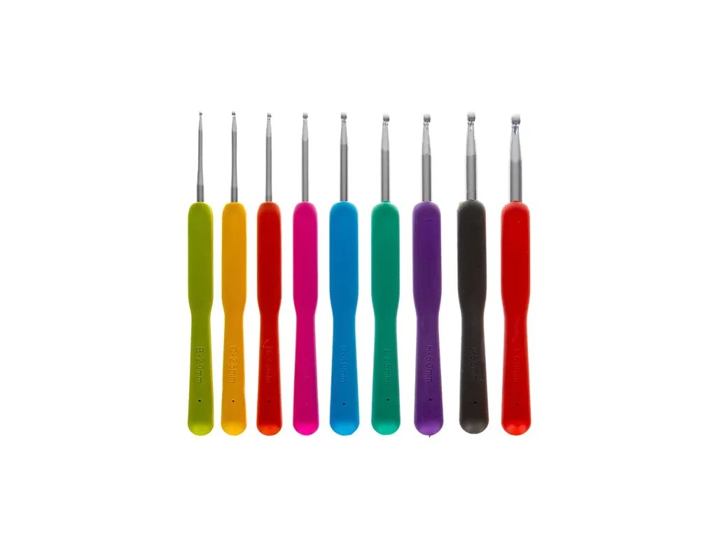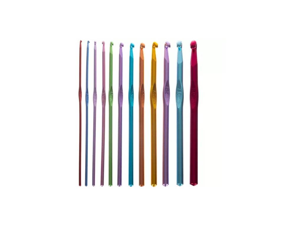 všechny velikosti háčků jsou jasně označeny - každý hliníkový háček má jasné označení velikosti a ergonomické zploštění, které zabraňuje únavě rukou, díky čemuž snadno dosáhnete správného nástroje i při intenzivním pletení