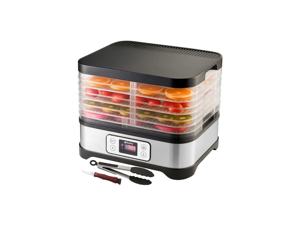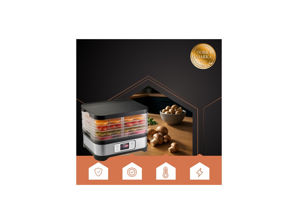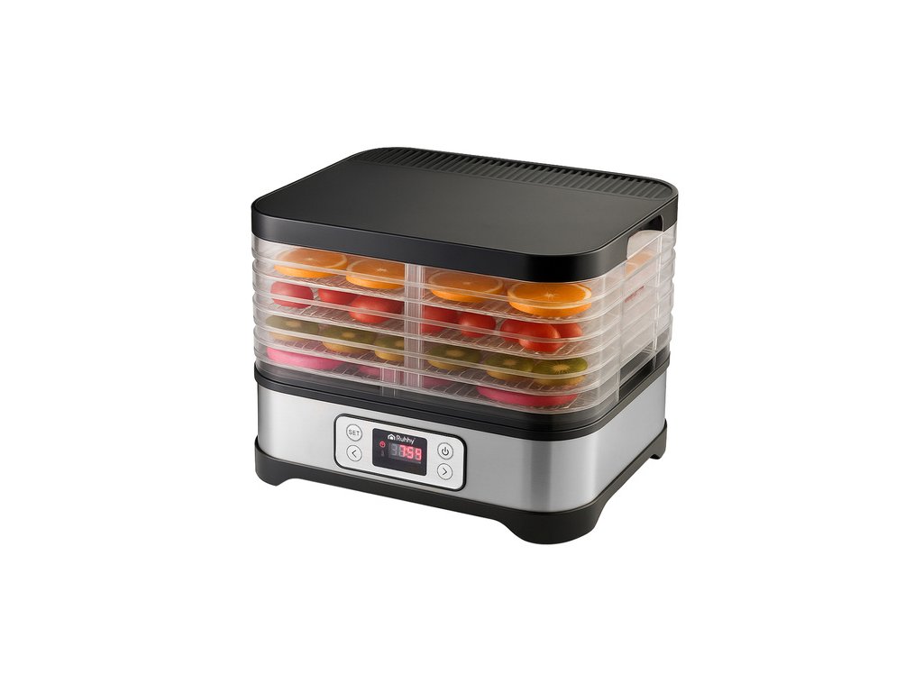 Univerzální sušička RUHHY s výkonem 400 W umožňuje sušit houby, ovoce, zeleninu a bylinky - má až 5 zásobníků s celkovou kapacitou 10 litrů, nastavitelnou teplotu (35-70 °C) a přehledný displej s programátorem až na 24 hodin. Sada obsahuje také zásobníky na tekuté produkty, síťky a nepřilnavé podložky - pro maximální pohodlí. Energeticky úsporná a vyrobená z bezpečných materiálů BEZ BPA - ideální do domácí spíže po celý rok.