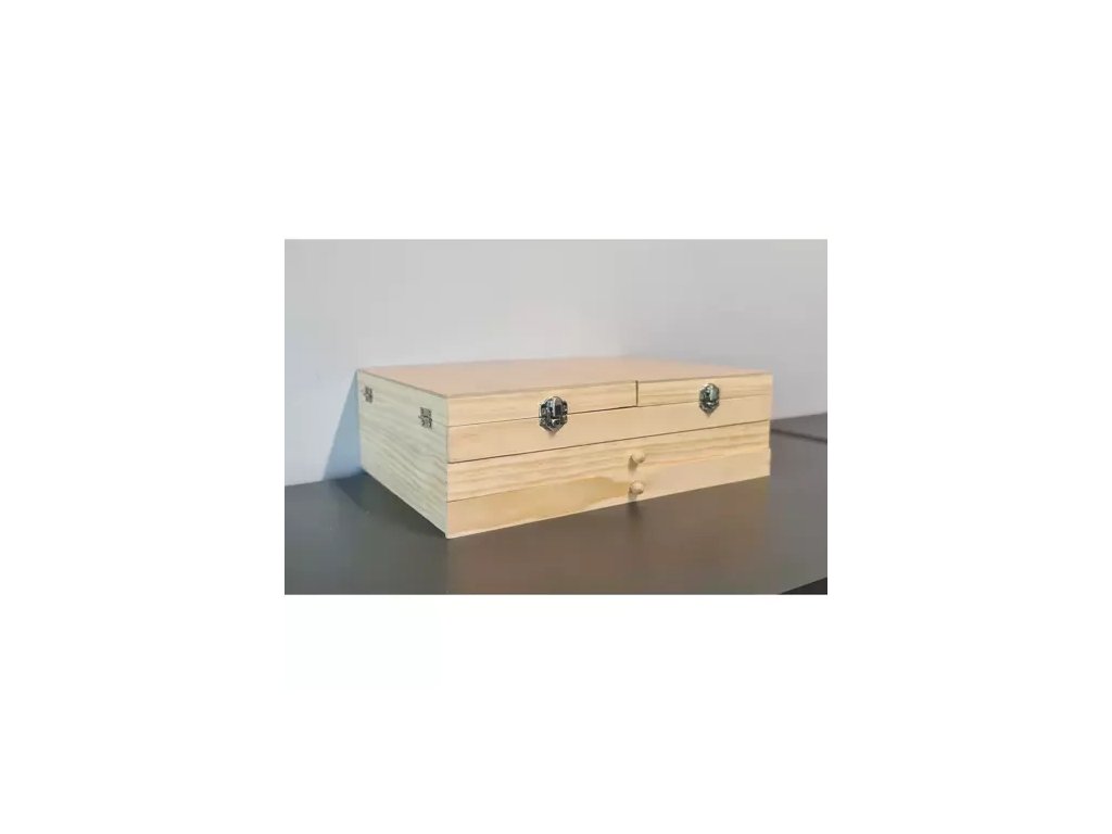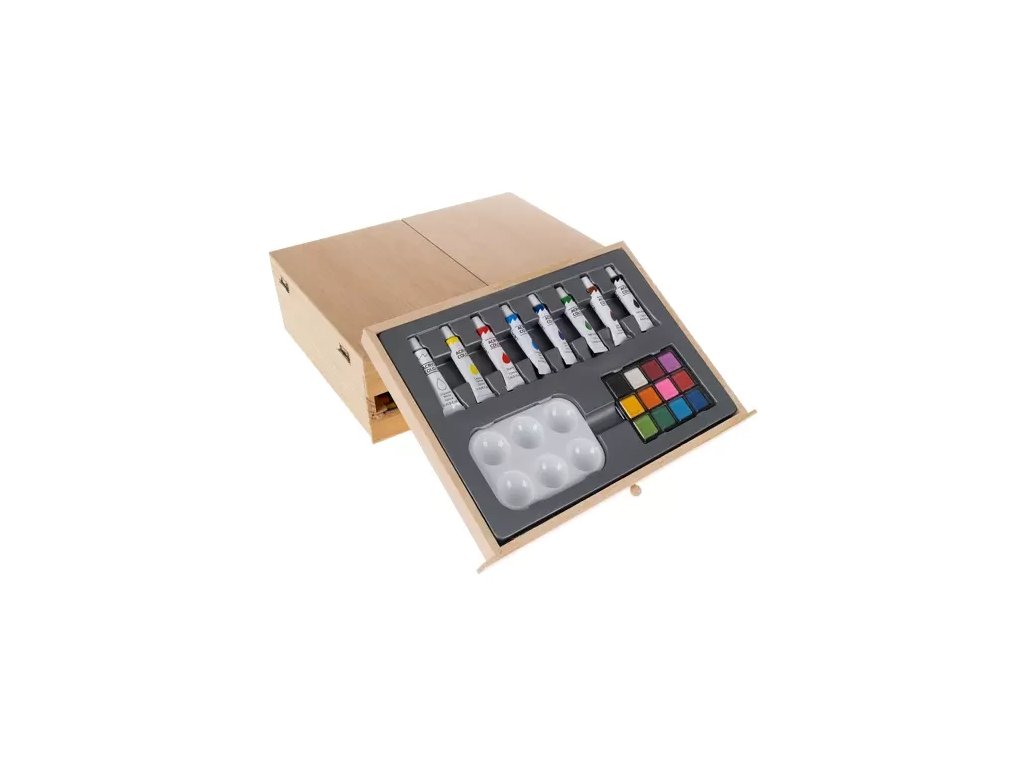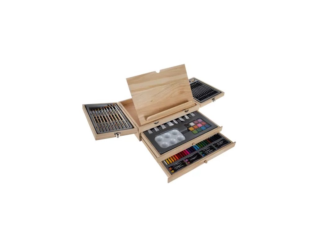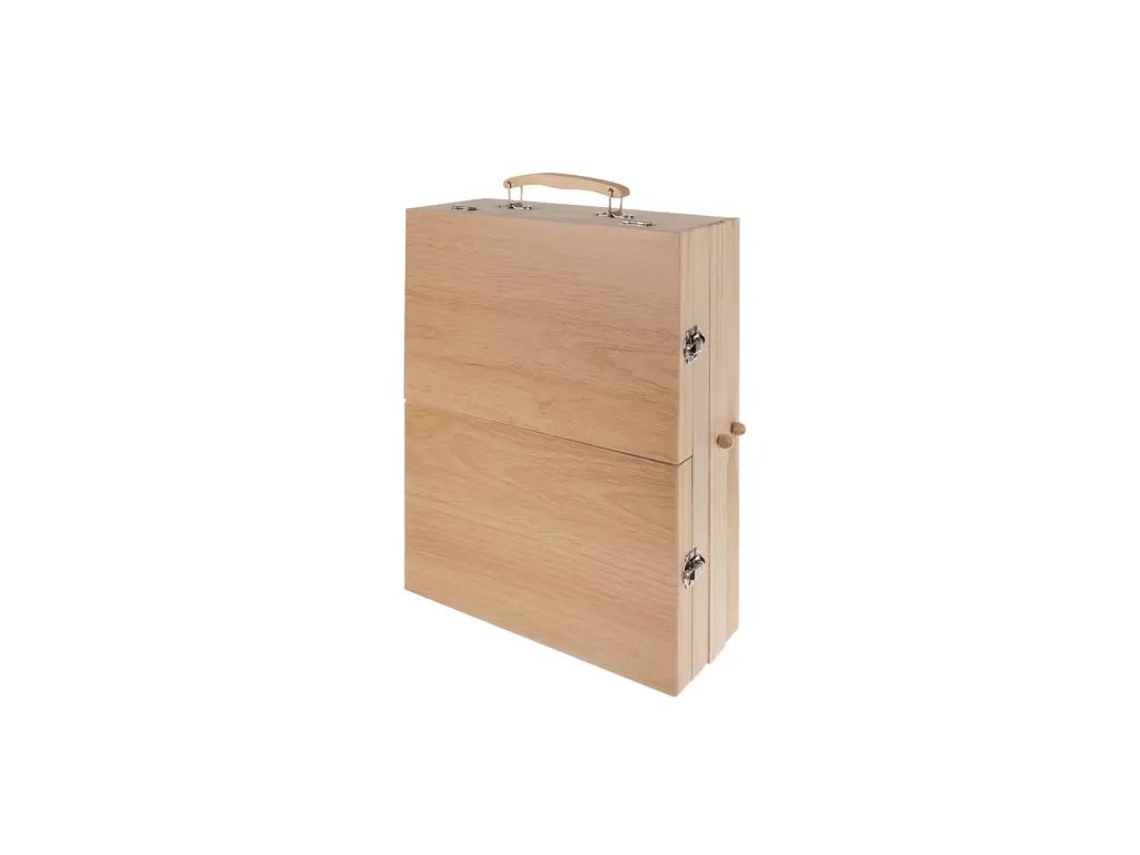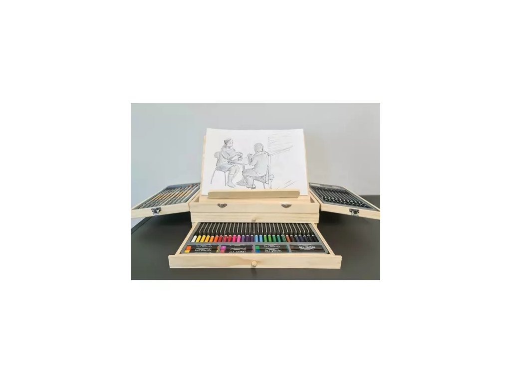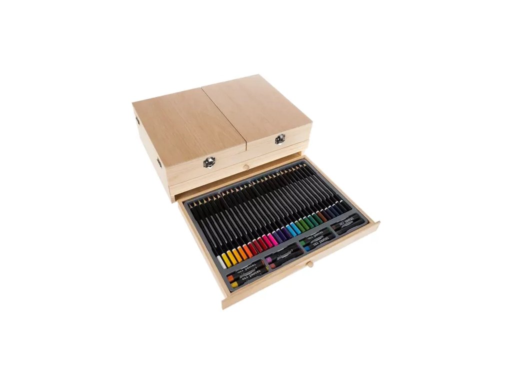 - PRAKTICKÝ KUFŘ Z 2 AMI ZÁSUVKA – výtvarná sada má praktický dřevěný kufr se zavíráním a madlem. Díky tomuto přeprava obsahu kufru je pohodlná a velmi jednoduchá .
