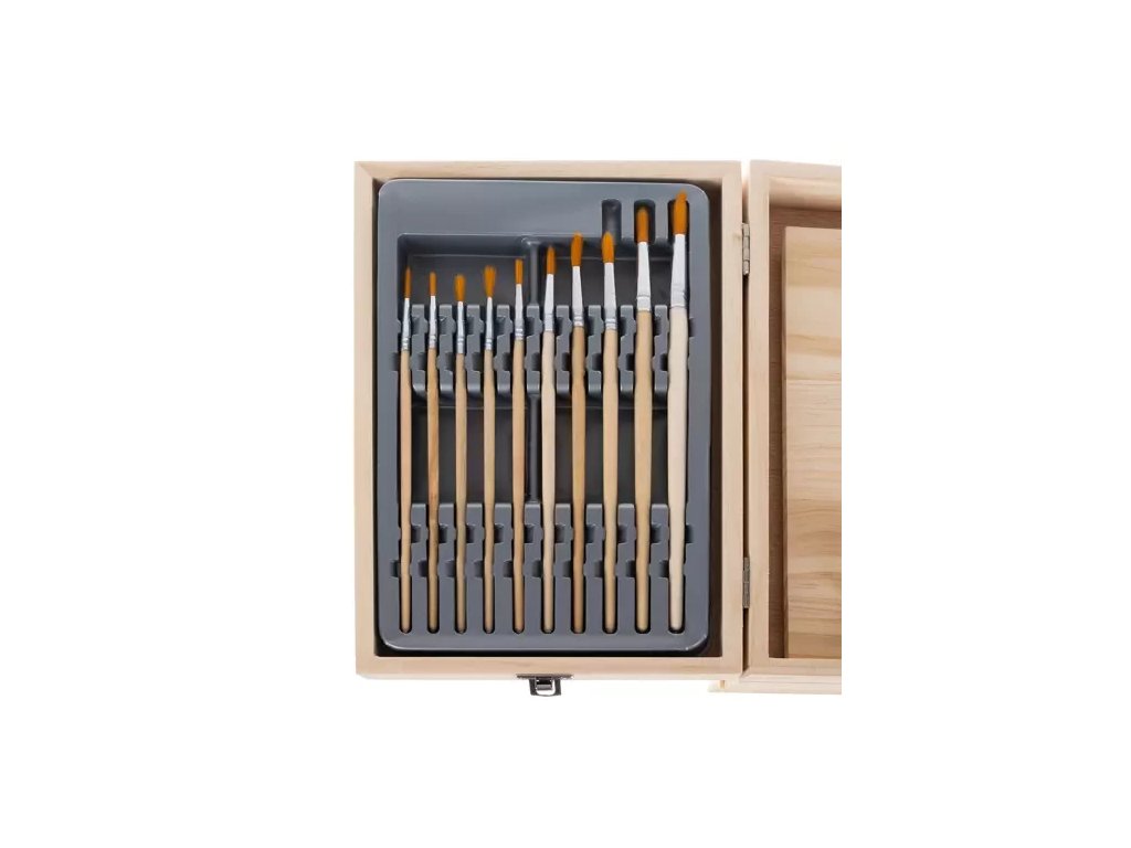 - 83 PRVKY – malířská sada v kufru má mnoho prvků, mezi které patří: kufr s podstavcem, skicák, 10 malířských štětců, 12 tužek různé měkkosti (2xV, 2 HB, 2xB, 2x2B, 2x4B, 2x6B), guma a ořezávátko, 8 akrylových barev, paleta, 12 akvarelových barev, 28 barevné tužky, 8 olejových pastelů.