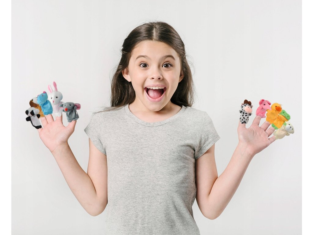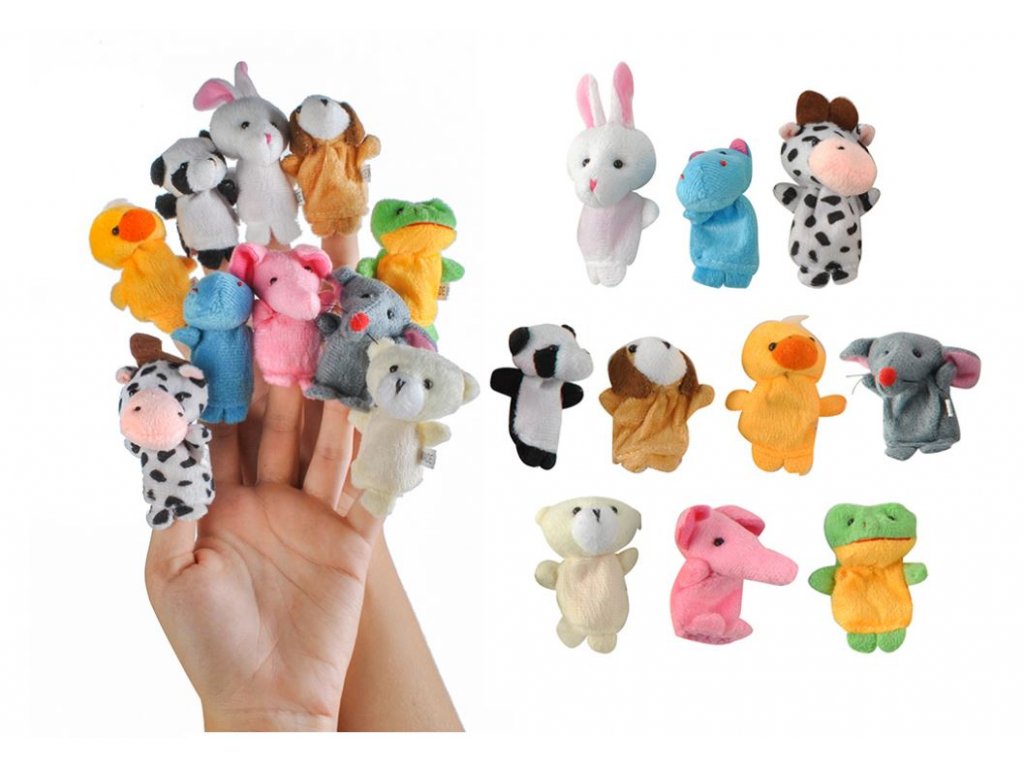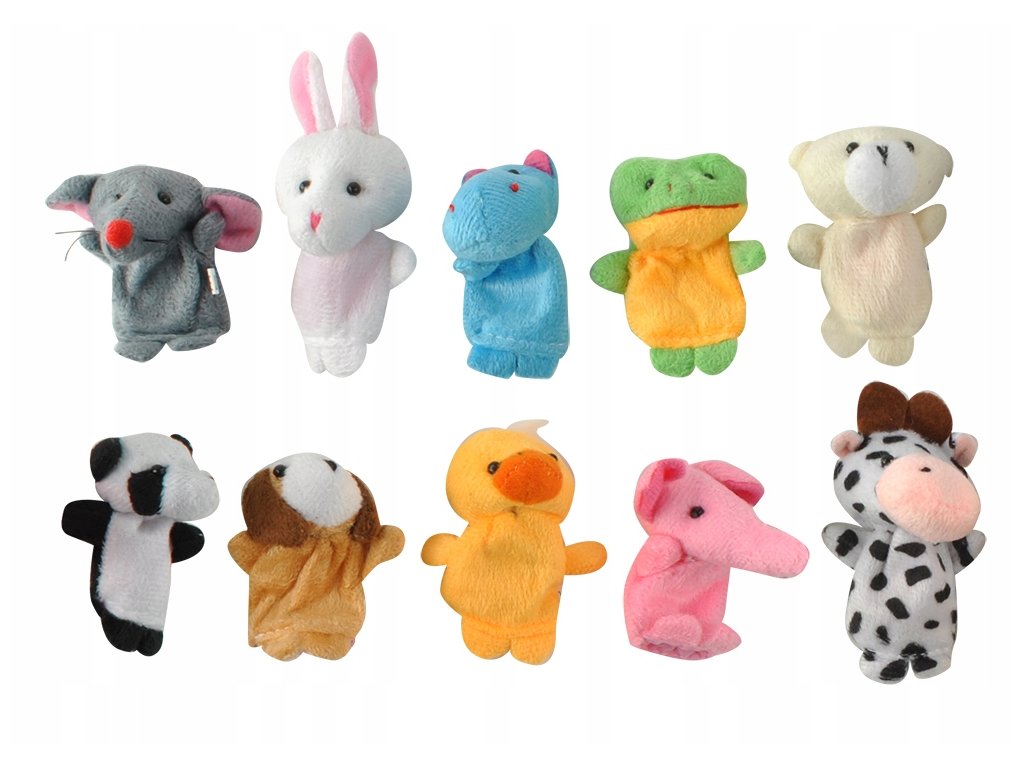 Sada deseti roztomilých maňásků na prst. Každý maňásek představuje jiné zvířátko (myš, králík, hroch, žába, medvěd, panda, pes, kachna, slon a kráva).