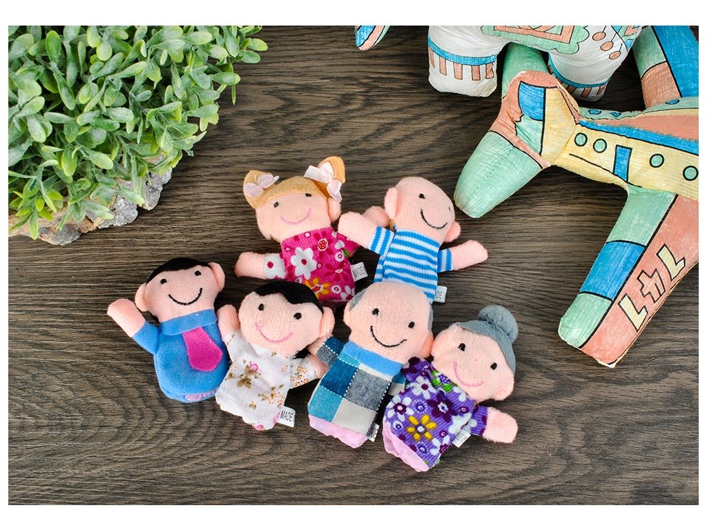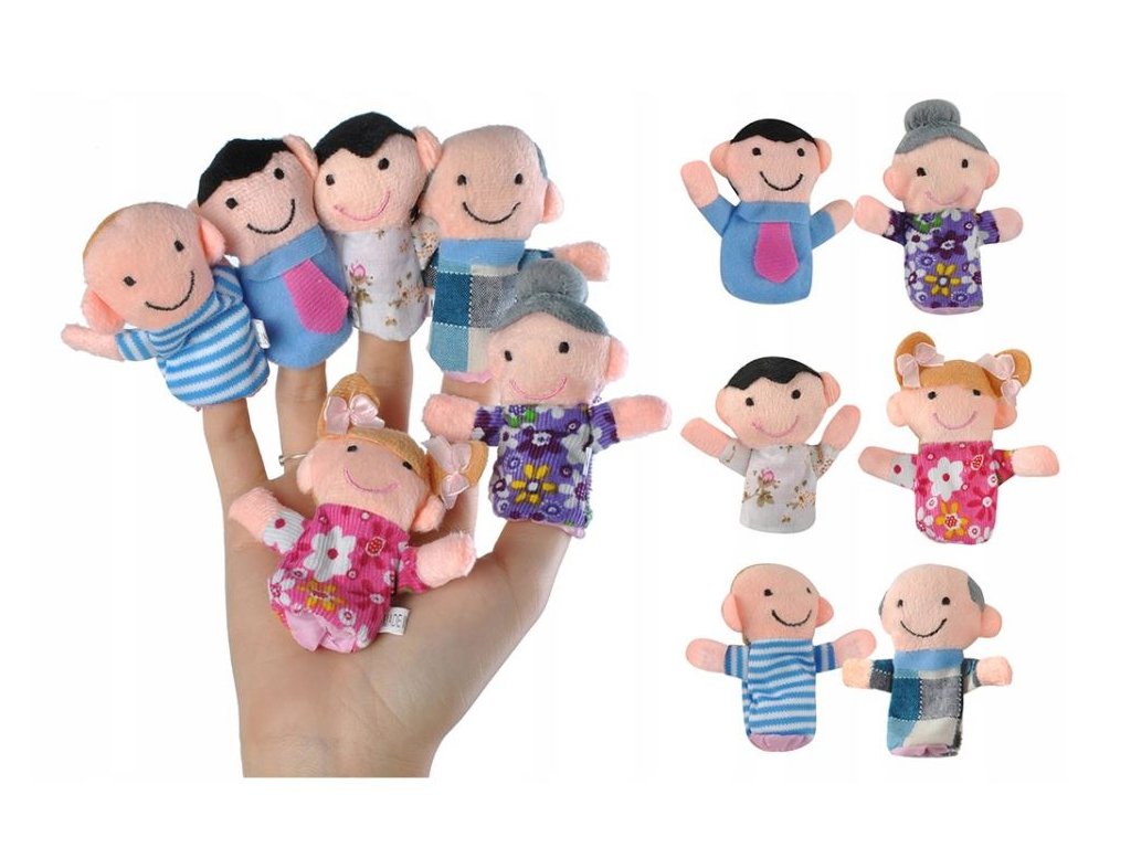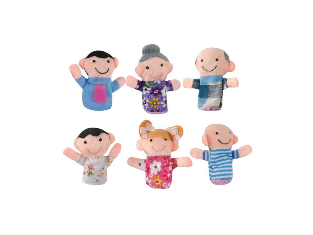 Sada šesti roztomilých maňásků na prst. Každý maňásek představuje jiného člena rodiny (dědeček, babička, maminka, tatínek, dcera a syn).