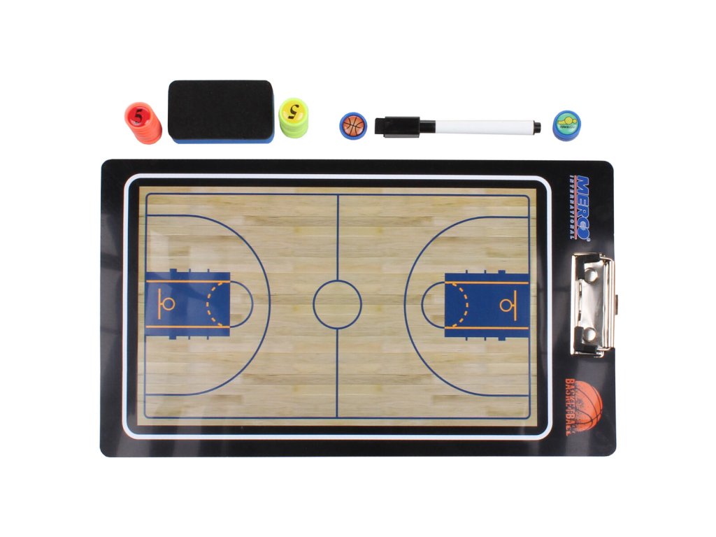 Trenérská tabule na basketbal je nezbytný doplněk každého basketbalového trenéra napříč všemi soutěžemi. Taktická basketbalová tabule Merco Basketbal 65 je oboustranná magnetická deska s barevným provedením celého basketbalového hřiště na straně jedné a barevným provedením poloviny basketbalového hřiště na straně druhé a to včetně dalších čtyř miniatur. Součástí basketbalové desky Merco Basketbal 65 je 13 magnetů (s motivy čísel, míče a rozhodčích), popisovač, mazací houbička a klip na další poznámky. Taktická deska Merco Basketbal 65 je nejsnazší a nejrychlejší cesta pro Vaše přesné herní pokyny hráčům kdykoliv během basketbalového zápasu.Doplňkové parametry