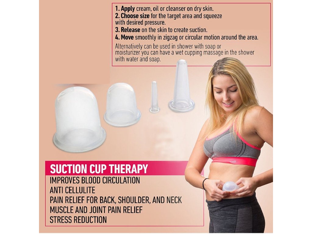 Silikonové masážní baňky jsou skvělým a rychlých pomocníkem pro masáž celého těla. Baňka funguje na systému podtlaku, který dokáže kůži a tkáně nadzvednout, čímž urychluje proces regenerace. Baňky jsou vhodné pro odstranění bolesti ztuhlého svalstva, při odbourávání celulitidy nebo pro zlepšení lymfatického toku. Před použitím důkladně očistěte pokožku. Na masírované místo doporučujeme nanést masážní krém nebo gel pro zvlhčení kůže. Při používání dejte pozor na to, aby jste jedno místo nemasírovali příliš dlouhou dobu. Tuto masážní pomůcku používejte jemně a nesnažte se vyvíjet nadměrnou sílu. Baňky pravidelně čistěte a dezinfikujte, aby nedošlo k jakémukoliv poškození pokožky nebo k tvorbě puchýřů. Sada Cups 4Pack obsahuje čtyři různé baňky: - 1) výška x spodní průměr: 8 x 7 cm - 2) výška x spodní průměr: 5,5 x 5,5 cm - 3) výška x spodní průměr: 8 x 3,7 cm - 4) výška x spodní průměr: 5 x 1,5 cm - hmotnost sady: cca 140 g - uvedená cena za 1 saduDoplňkové parametry