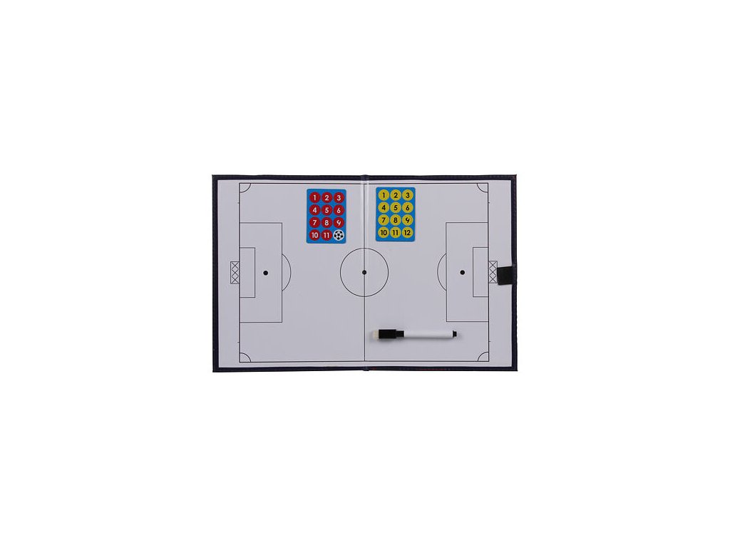 Trenérská tabule na fotbal je nezbytný doplněk každého fotbalového trenéra napříč všemi soutěžemi. Taktická fotbalová tabule Merco FOTBAL 39 je magnetická deska s černobílým provedením celého fotbalového hřiště v modrých deskách ze syntetické kůže. Součástí fotbalové tabule Merco FOTBAL 39 jsou dvě sady magnetů a popisovač. rozměry: 270 x 210 mm / 270 x 420 mmDoplňkové parametry