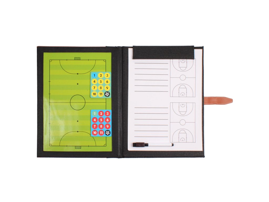 Trenérská tabule Futsal RX94 patří mezi vybavení trenérů soutěžních futsalových klubů pro demonstrování a plánování herního postupu. Tvrdé magnetické desky tabule jsou zhotovené ze syntetické PU kůže s celkovou hmotností přibližně 600 gramů. Magnetická trenérská tabule po rozložení znázorňuje na jedné polovině celé futsalové hřiště ve formátu A4. Druhá strana desek je doplněná magnetickým klipem s předtištěnými papíry pro vyplnění herních postupů a strategií. Pro rozmístění hráčů v poli využijete dvě sady magnetů s čísly (11 žlutých, 11 červených a 2 černé). Pro znázornění dalších strategických pokynů poslouží černý popisovač s houbičkou. Rozměry tabule v zavřeném stavu jsou 32 x 24 cm (formát A4).Doplňkové parametry