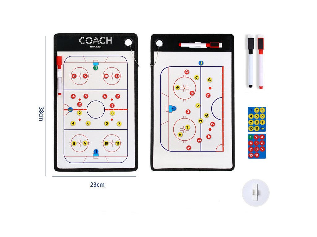 Merco Hockey 38 patří mezi základní vybavení každého trenéra hokeje a slouží pro demonstrování a plánování herních strategií. Pro rozmístění hráčů v poli využijete dvě sady odlišně barevných magnetů s čísly a pro další tahy a znázornění pohybů hráčů popisovač s houbičkou. Magnetická tabule nabízí z jedné strany náhled na celé hřiště a z druhé strany na polovinu hřiště. Taktická deska Merco Hockey 38 je nejsnazší a nejrychlejší cesta pro vaše přesné herní pokyny hráčům kdykoliv během zápasu! - rozměry tabule: 38 x 23 cm - hmotnost balení: cca 0,4 kgDoplňkové parametry