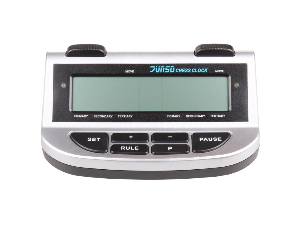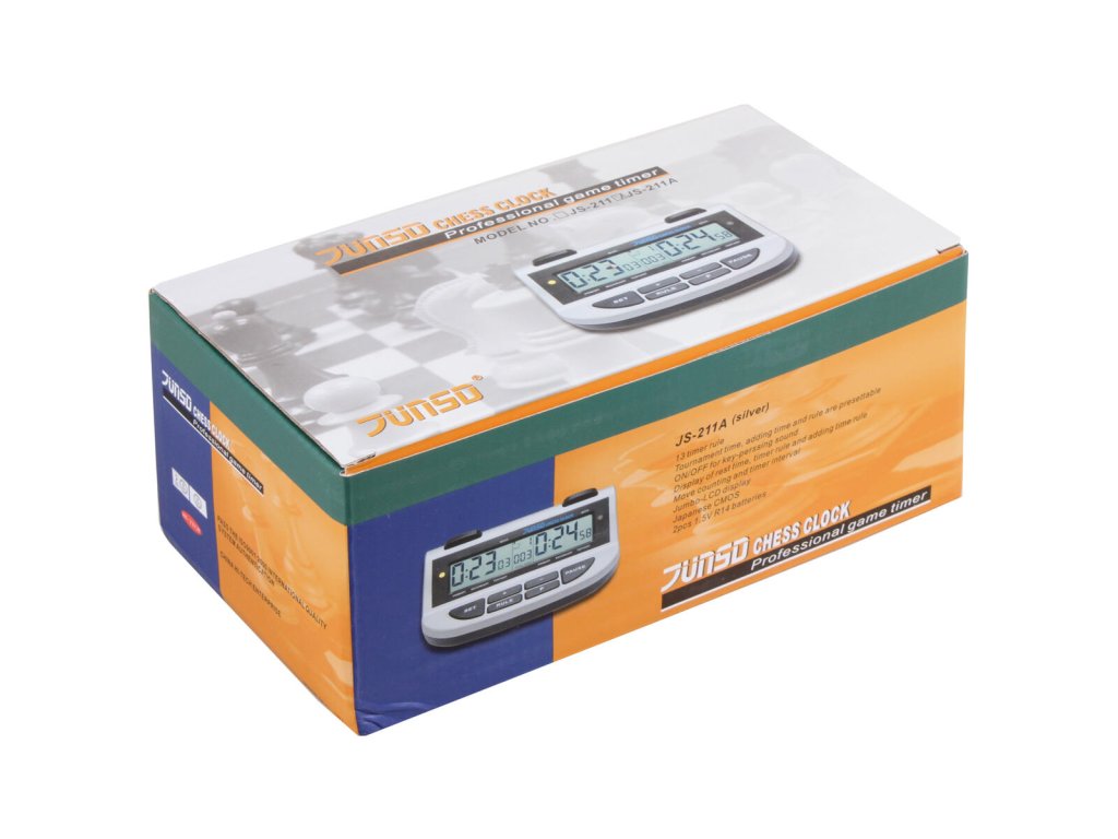 Šachové hodiny JUNSD JS-211A patří mezi profesionální modely, jsou vhodné pro šachové turnaje i rekreační hráče, kteří chtějí svou hru posunout na vyšší úroveň. Tyto hodiny také nabízí nádherný design a velký LCD displej, díky kterému čísla uvidíte jasně a zřetelně. Funkce: 13 různých pravidel časovače; různé výběry programů; 2 různé zvuky časovače pro dva hráče; hrací čas, tahy – mohou být zaznamenány automaticky; zobrazuje celkový počet tahů, časový interval a čas pro oba hráče; velký LCD displej; 2x 1.5V R14 baterie; 108 x 90 x 65 mm. Baterie jsou součástí balení.Doplňkové parametry