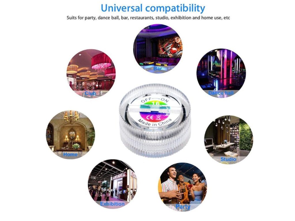 Sada šesti ponorných světel Merco LED RC LIGHT 6 je doplněk do bytu, díky jeho voděodolné konstrukci jej můžete použít například do akvária či vázy a oživit tak svou domácnost. Toto světlo je vyrobené z ABS plastu se třemi diodami a součástí balení je i dálkové ovládání, s jehož pomocí můžete libovolně měnit barvy, režim svícení a blikání nebo měnit intenzitu světla. Používání: Před prvním použitím odstraňte vložky u baterií. Vždy se ujistěte, že je světlo dostatečně utěsněné před ponořením do vody. Vybité baterie nevyhazujte do směsného odpadu, ale pouze do sběrných nádob k tomu speciálně určených. Ukládejte mimo dosah dětí, hrozí spolknutí malých částí! Ovládání: - 16 různých barev - 4 režimy svícení / blikání - nastavení intenzity světla - dosah dálkového ovládání: 3 m - světla lze nastavovat i jednotlivě dle jejich vzdálenosti od ovladače LED RC LIGHT 6: - počet světel: 6 ks - materiál: ABS - rozměry 30 x 23 mm - napájení: 2x CR2032 - počet LED: 3 3528RGB - vstupní napětí: 6V - výdrž: cca 7 - 20 h - dálkové ovládání, baterie CR2035 - úroveň vodotěsnosti: IP68Doplňkové parametry