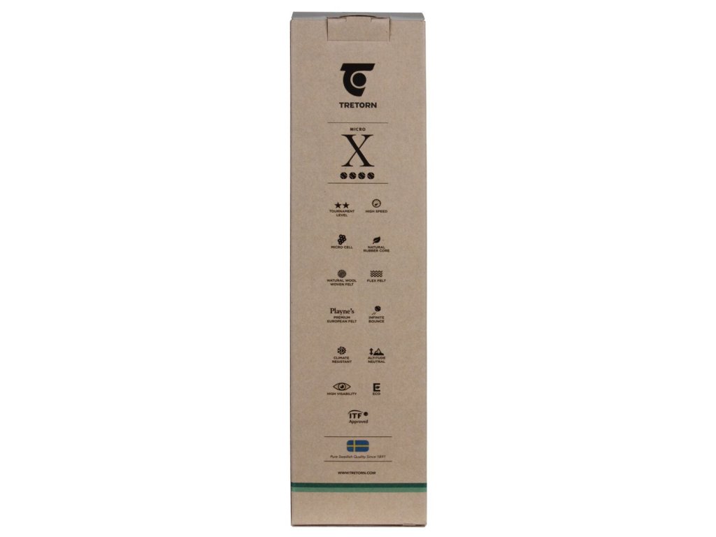 Tenisový míč je naplněný 700 miliony mikrobuněk. Speciálně vyvinuté měkké gumové jádro pro mikrobuněčnou konstrukci, speciální melton FLEX FELT, který zdokonaluje hratelnost a cit míče, kombinace gumového jádra, meltonu a použité technologie dohromady vytváří vynikající herní vlastnosti a zjišťuje excelentní kontrolu míče, schválen ITF a USTA. Vynikající hratelnost, vynikající trvanlivost, žádná ztráta tlaku a tvaru, lehký herní pocit, stálé herní vlastnosti po celou dobu, neomezená skladovatelnost, speciální zvukové vlastnosti, nejlepší míč ve vysokých nadm. výškách a v chladných podmínkách, super cena s ohledem na odehraný čas. Tretorn MICRO X je tenisový míč budoucnosti, je to příslušník třetí generace tenisových míčů. Byly klasifikovány a schváleny ITF jako „Micro cell pressure“. Tyto míče nejsou srovnatelné s netlakovými. Každý míč je vyplněn 700 miliony mikrobuněk, každá má v průměru 5-100 mikrometrů. Každá z těchto buněk je vyplněna vzduchem. Tyto buňky pracují skoro stejně jako natlakovaný vzduch v míčku, jediný rozdíl je v tom, že tento vzduch neuniká. Samozřejmě, herní vlastnosti obou míčů nejsou stejné. Je velmi těžké srovnávat tlakové míče s MICRO X, protože jsou to dva různé typy a protože tlakové míče mění své vlastnosti velmi často a rychle. Pocity z MICRO X podle hráčů a odborníků jsou následující: Vysoká preciznost výborná kontrola zaručená neměnnost odrazu žádná ztráta výkonnosti po hodinách hraní menší rotace než u nového tlakového míče, ale větší než u použitého tlakového míče vysoká dosahovaná rychlost optimální hmotnost perfektní trvanlivost a stálost parametrůDoplňkové parametry