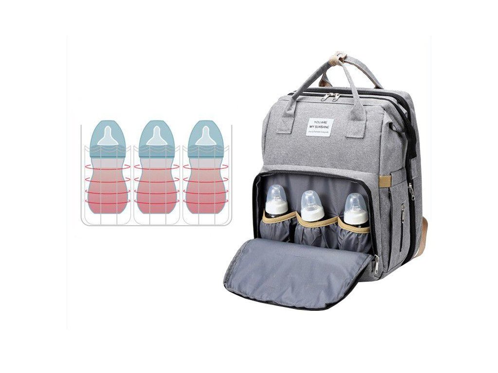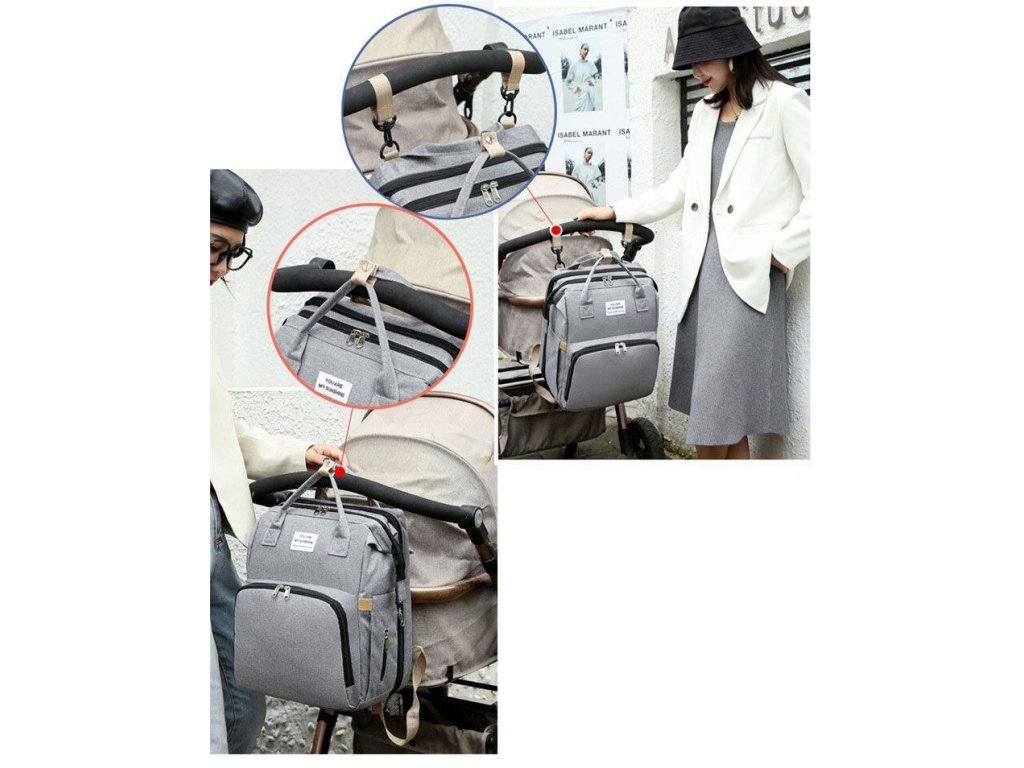 Tento unikátní batoh pro maminky Mommy je praktickou pomůckou pro všechny, kteří se starají o malé děťátko. Batoh se skládá ze dvou velkých přihrádek, přičemž jednu z nich jde pomocí rozepnutí zipu proměnit na pohodlnou přebalovací podložku s vložkou ze síťoviny. Můžete tak kdykoliv a kdekoliv své miminko přebalit. Druhá přihrádka slouží jako klasická kapsa batohu - můžete v ní přenášet plenky, plenkové kalhotky, vlhčené ubrousky, dětskou výživu, láhev s vodou nebo náhradní oblečení. V menší přední kapse na zip jsou 3 přihrádky s termoizolační stélkou, do kterých můžete vložit například dětské lahvičky. Po stranách batohu se nachází ještě dvě přihrádky, vhodné na láhev nebo deštník. V jedné z přihrádek je otvor na zip, který když rozepnete, můžete vytahovat vlhčené kapesníčky přímo z kapsičky. Součástí batohu jsou i dva traky s karabinami, díky kterým batoh jednoduše připevníte na madlo nebo konstrukci kočárku. Návod na rozložení přebalovacího prostoru: U velké zadní kapsy rozepněte zip zcela kolem dokola. Tahem od sebe rozložte tkaninu. Dvě přiložené výztužné tyčky vsuňte do otvorů v horním lemu postranní síťky. Do vzniklé ohrádky vložte na dno vložku ze síťoviny. Přebalovací podložka je připravena k použití. Rozměry batohu: 40x30x20 cm Rozměry přebalovací podložky: cca 70x30 cm Materiál: tkanina Oxford, polyesterDoplňkové parametry