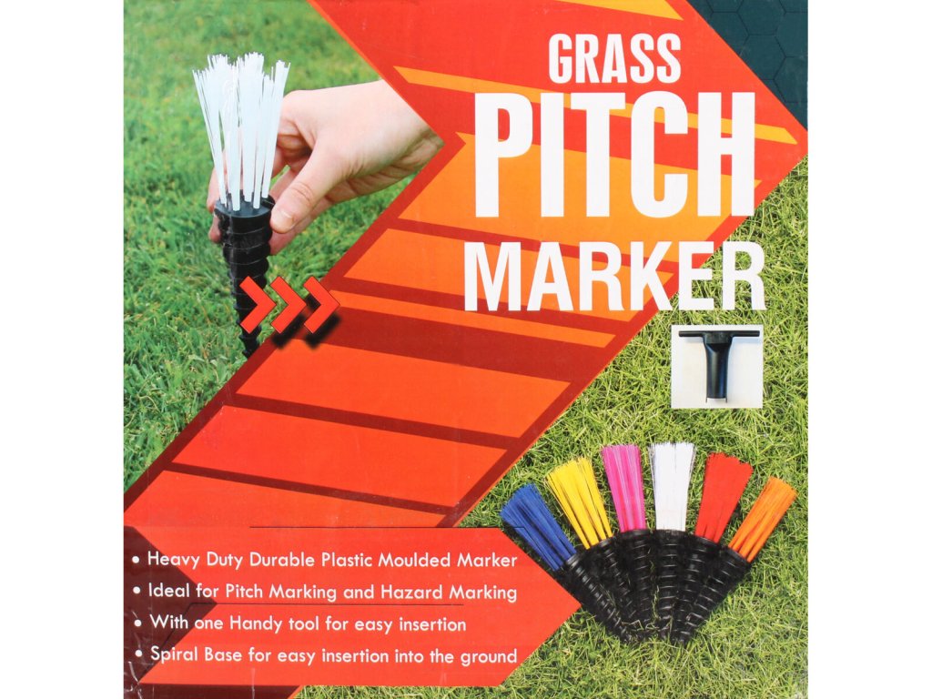Značkovací systém Pitch Marker je kvalitní pomůcka pro vymezení tréninkové plochy, vyznačování lajn, velkého, malého vápna nebo středového kruhu u travnatého (fotbalového) hřiště, poté zaručuje přesné, rychlé nalajnování. Značkovací systém nabízíme v několika barvách. Klasicky jednoduchá manipulace díky šroubovací kovové hlavici, do které zasunete kolík. Kolík je vyrobený z odolného plastu a připomíná vrták. Otáčivými pohyby jednoduše upevníte kolík do travnaté plochy. Vrták má na horní straně barevné štětinky pro dobrou viditelnost. Využití nalezne také u vyznačení pozemků (staveb), parkovacích ploch, tras energetických rozvodů, apod. V balení naleznete 25 kusů vyznačovacích kolíků a 1 kus šroubovací hlavice. Doporučujeme: Jakmile kolík zarazíte do země, nasypejte do štětinek trochu jemného písku a udusejte, aby se vlákna štětinek co nejvíce rozevřela a vytvořila tak vějíř o průměru cca 7-8 cm. Parametry: výška kolíku: 10 cm výška štětinek: 8 cm obsah balení: 25x kolík, 1x šroubovací hlaviceDoplňkové parametry
