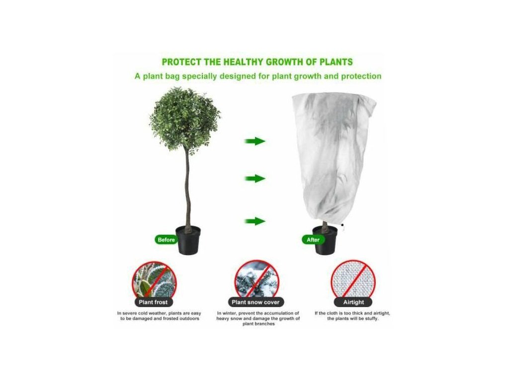 Ochranný vak na rostliny je skvělý pomocník pro každého zahradníka. Vak Plant Cover 180x120 je vyrobený z netkané textilie odolné vůči UV záření. Vak chrání rostliny a keře před mrazem, sněhem, hmyzem, ptáky a přímým slunečním světlem. Rozměry ochranného vaku jsou přibližně 180 x 120 cm. Ve spodní části vaku je šňůrka pro jednoduché utahování. Parametry: - rozměry: cca 180 x 120 cm (výška x šířka) - materiál: netkaná textilie - hmotnost: 192 gDoplňkové parametry
