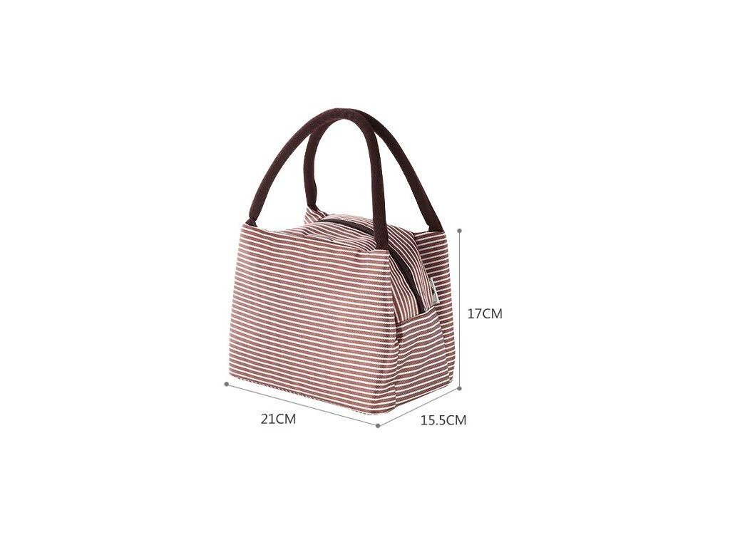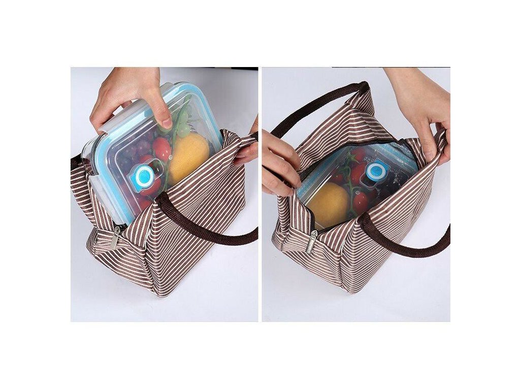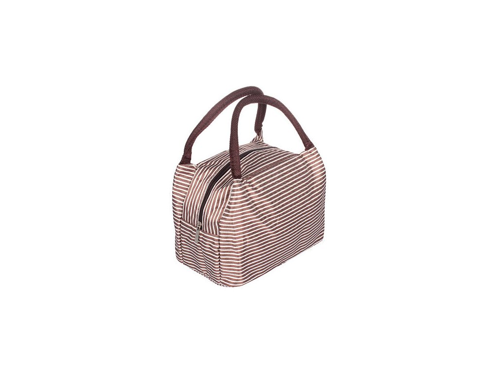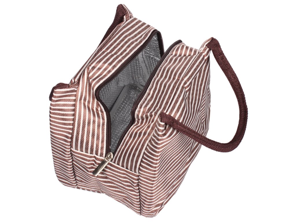 Chystáte si vzít s sebou na výlet svačinu? Zapomeňte na igelitové pytlíky. S touto stylovou termotaškou Merco se vám svačina bude nosit mnohem snadněji. Taška je skvělým pomocníkem na výlety, kempování, piknik nebo k vodě. Hodí se i na přenášení oběda do práce či do školy. Termotaška má rozměry 21 x 15,5 x 17 cm a je vyrobena z tkaniny Oxford s atraktivním pruhovaným designem, který nabízíme ve třech barevných provedeních (červená-bílá, hnědá-bílá, černá-bílá). Díky vnitřní vrstvě z ALU fólie si potraviny a nápoje déle udrží svoji teplotu. Taška má zapínání na zip a dvě pevná ucha pro snadnější přenášení. Termotašku lze po použití snadno složit, aby nezabírala příliš místa. Pro odstranění případných nečistot od potravin lze termotašku otřít vlhkým hadříkem. Tašku neperte v pračce. Před výletem už tedy nezbývá nic jiného než dát do termotašky krabičku s obědem nebo svačinou, přidat ovoce a plechovku s pitím a vyrazit.Doplňkové parametry