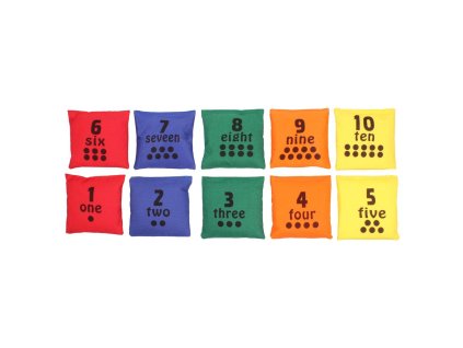 Sada deseti barevných bean bagů s čísly pro učení dětí zábavnou formou.