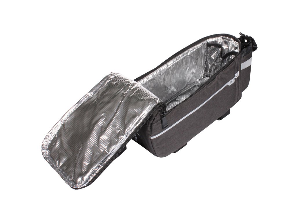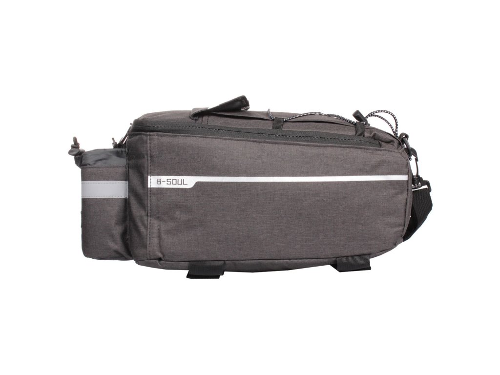Brašna na nosič Rear 1.0 je praktickým pomocníkem pro každý cyklovýlet. Prostor brašny nabízí hlavní přihrádku s objemem cca 10 litrů a je zhotovena z robustních stěn s termoizolační podšívkou, aby chlazené nápoje vydržely osvěžující, nebo aby teplé jídlo vydželo co nejdéle teplé. Vnější rozměry brašny jsou 38 x 16 x 15,5 cm. Vedle hlavní přihrádky je Rear 1.0 vybavená dvěmi menšími kapsami. Menší svrchní kapsou a otevřenou kapsou na láhev. Elastické gumolano na svrchní straně brašny je vhodné pro uchycení bundy nebo deky navíc. Instalace brašny ke konstrukci kola je snadná díky dvěma délkově nastavitelným suchým zipům. Brašna je doplněná také o délkově nastavitelný ramenní popruh pro snadné přenášení. Moderní cyklistické vybavení od společnosti B-SOUL vám zpříjemní výlety na kole.Doplňkové parametry