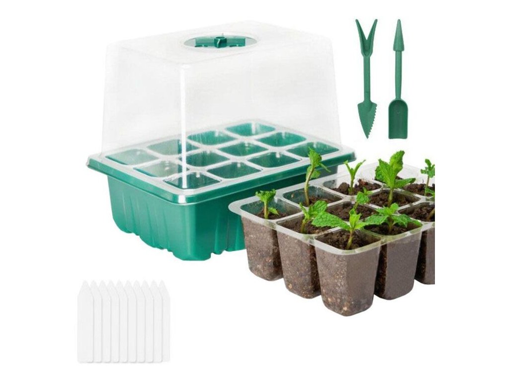 Rádi zahradničíte a pěstujete si vlastní rostlinky ze semínek? Pak je pro vás ideální minipařeniště Seedling Pot 12. Tento malý skleníček se používá pro předpěstování sazenic, řízkování rostlin a klíčení semínek. Seedling Pot 12 je vyrobený z PET plastu a skládá se ze zelené podmisky, průhledné vložky na sazenice s otovory pro odtok vody, průhledného víka, na kterém se dá nastavit proudění vzduchu, 10 zápichů pro označení sazenic a plastového mini zahradnického náčiní. Každé minipařeniště má 12 otvorů pro sazenice a celý set Seedling Pot 12 obsahuje 5 kusů minipařenišť. Jedno minipařeniště má rozměry 18,5 x 16 x 14,5 cm (ŠxVxD) a velkou výhodou oproti konkurenčním minipařníkům je dostatečně vysoké víko. Návod: 1) Navlhčete zeminu, nejlépe rozprašovačem. 2) Plastovou mini lopatkou naplňte otvory zeminou. 3) Mini sázecím kolíkem vytvořte důlky pro semínka nebo řízky. Semínka umístěte do důlků. 4) Můžete použít bílé zápichy pro označení rostlinek. 5) Pařeniště přiklopte průhledným víkem a zeleným kolečkem nastavte proudění vzduchu (mikroklima). 6) Pravidelně vlhčete zeminu, můžete přidat i hnojivo. 7) Pařeniště umístěte na světlé a teplé místo. 8) Pro vyjmutí sazenic můžete využít druhý přiložený mini nástroj. Tipy: Označte si všechna semínka. Použijte kvalitní zeminu, můžete se tak vyhnout případným škůdcům a plesnivění rostlin. Doporučujeme do každého květníčku zasadit 2-3 semínka, abyste zvýšili šanci na úspěšné pěstování. Před vyjmutím sazenic z květníčků nechte zeminu mírně proschnout, půjdou pak lépe vyjmout. Obsah balení: 5 ks zelených podmisek 5 ks průhledných vložek s květníčky (1 květníček má rozměr 3,8 x 3,8 x 5,5 cm) 5 ks průhledných víček 5 ks koleček pro úpravu mikroklimatu v pařeništi 10 ks štítků na označení rostlin 2 ks mini zahradního náčin Materiál: PET plastDoplňkové parametry