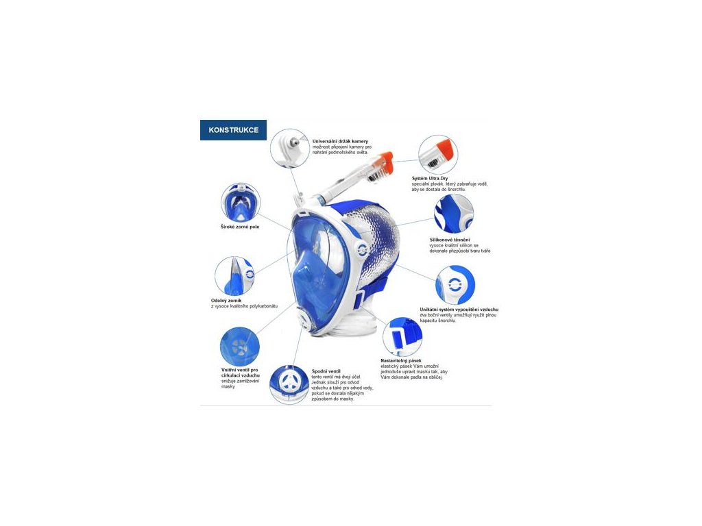 Potápěčská maska Aqua-Speed Spectra 2.0 KID nabízí zcela nový pohled na podvodní svět. Celoobličejová maska Spectra Vám rozšíří obzory při šnorchlování nebo potápění v malých hloubkách (při sestupu do větších hloubek je nutné vyrovnávat tlak v uších, což není v celoobličejové masce z důvodu nedostatečného přístupu k nosu možné). Konstrukce masky Spectra 2.0 KID je ale vhodná i pro ty potápěče, kteří považují tradiční potápěčské brýle a šnorchl za nepohodlné nebo je dokonce vůbec nemohou používat. Masku Spectra tvoří plastová konstrukce, jejíž součástí je těsnění z vysoce kvalitního antialergenního silikonového kaučuku (LSR). Tvar masky a vlastnosti umožňují pohodlné přizpůsobení mnoha velikostem i tvarům obličeje. K přesnému usazení a utěsnění slouží dva široké, délkově nastavitelné gumové pásky. Součástí masky je i pět ventilů. Dva boční ventily v úrovni očí napomáhají k proudění vzduchu, dva ventily v úrovni nosu slouží pro minimalizaci zamlžování visoru a ventil uložený v nejnižším bodě masky je pak určený k vydechování. Ten slouží i k odvodu vody v případě, že se uvnitř masky z nějakého důvodu voda přeci jen ocitne. Tady stačí pouze zvednout hlavu nad hladinu nebo přímo ve vodě energicky vydechnout a nežádoucí voda odteče. Nezkreslený výhled zajišťuje konstrukce s minimálním vnitřním objemem a proti slunečnímu svitu mírně zabarvený visor z vysoce kvalitního odolného polykarbonátu. O přívod dostatečného množství vzduchu a následný odvod vzduchu se stará šnorchl s širokým průřezem. Ten je na svém konci vybavený systémem Ultra-Dry, který zabraňuje vniknutí vody do dýchací trubice. Šnorchl lze snadno složit, což umožňuje snazší přepravu i uskladnění. Maska Spectra 2.0 KID je balena v síťovaném stahovacím bagu. Jak zvolit správnou velikost potápěčské masky Aqua-Speed Spectra? Tento model je k dispozici ve dvou velikostech. Pokud nemáte možnost vyzkoušet si masku před zakoupením, použijte následující metodu k měření velikosti obličeje: Zavřete ústa a změřte vzdálenost mezi okrajem brady a obočím. Je-li vzdálenost menší než 12 cm, zvolte velikost S. Je-li vzdálenost větší, zvolte velikost L.Doplňkové parametry
