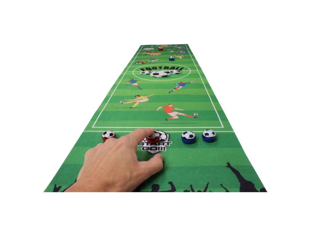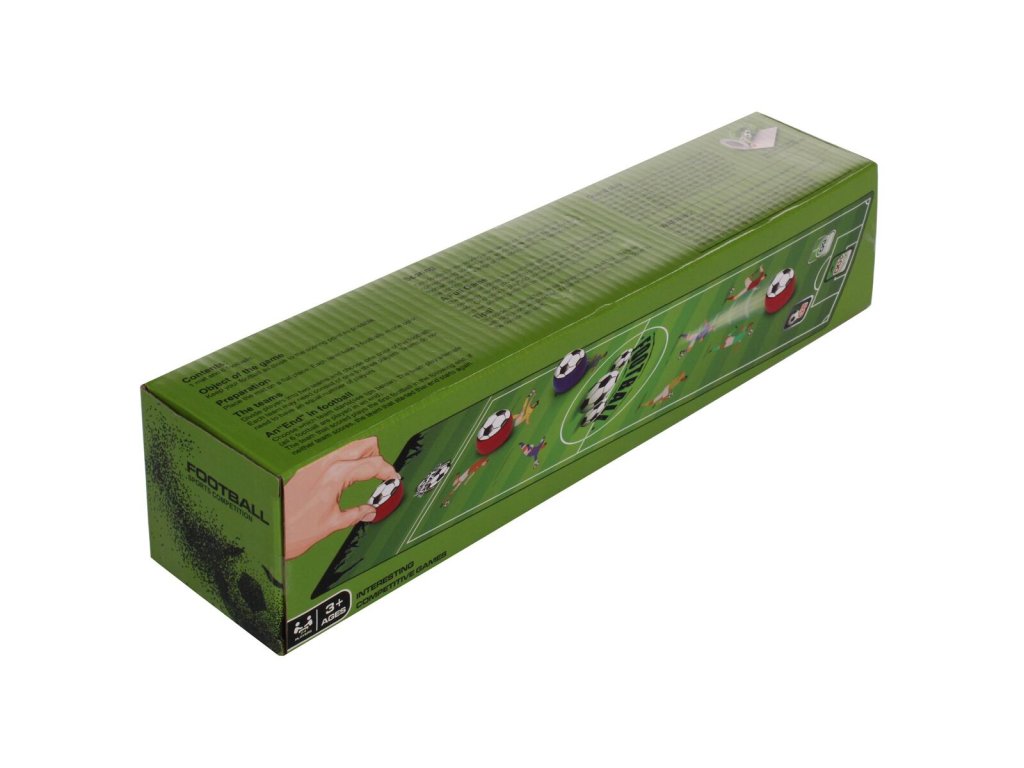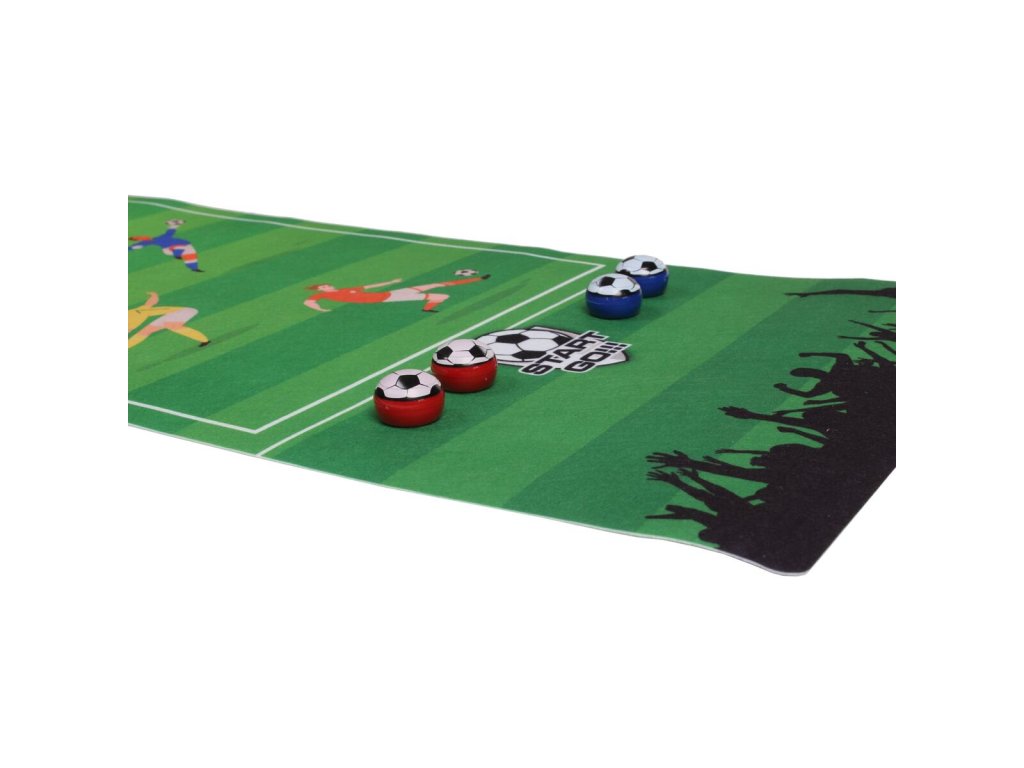 Merco Table Football je jednoduchá stolní společenská hra, při které si užijí spoustu zábavy jak děti, tak dospělí. Posouváním hracích kamenů v podobě fotbalových míčů s kovovou kuličkou na spodní části se na filcové hrací ploše trefuje fotbalová branka a další cíle na hřišti s různými bodovými ohodnoceními. Tým, který trefí více branek, nebo bodovaných oblastí, vyhrává. Hra je uložena v praktickém balení, takže je snadno přenosná a vy si jí můžete na rovném povrchu zahrát kdekoliv a kdykoliv. Užijete si chvíle zábavy i napětí se společenskou hrou Merco Table Football. Obsah balení: - 1 x hrací plocha z filcového materiálu, rozměr: 120 x 30 cm - 6 x plastový hrací kámen s kovovou kuličkou. Ve dvou barvách, průměr kamene 2,5 cm - Rozměr balení: 33 x 7 x 7 cm - Váha balení: 245 g Pravidla hry: 1. Rozdělte se na dva týmy, každý tým má 3 hrací kameny ve stejné barvě. 2. Rozlosujte, který tým bude začínat. 3. Posunutím hracího kamene se snažte trefit branku nebo jiné bodované části hracího pole. 4. Po každém pokusu se týmy střídají. V další kole začíná ten tým, který v předchozím kole získal více bodů. 5. Body se počítají pouze pokud trefíte bodovanou část. Platný je i pokus, když trefíte pouze okraj bodované části. 6. Pokud trefíte symbol červené karty, body se odečítají. 7. Hra končí po použití všech kamenů a spočítáním bodů. Můžete si však zvolit, že budete hrát na více kol a body spočítat až po dohrání všech kol. Vítězí tým s více body. Varianta - obranná hra: Obránce rozmístí své tři míče v zadní polovině hřiště, jeden míč umístí do oblasti 100 bodů a zbylé dva míče jako obránce. Útočící strana musí použít své tři míče k tomu, aby odpálila míč bránící strany mimo bodovací oblast. Po útoku a obraně si obránci a útočníci vymění pole a pokračují ve hře. Za úspěšnou obranu nebo útok se zapisuje 1 bod a vyhrává tým, který jako první získá 10 bodů. Hra je určena pro 2-6 hráčů a je vhodná pro děti od 6 let.Doplňkové parametry