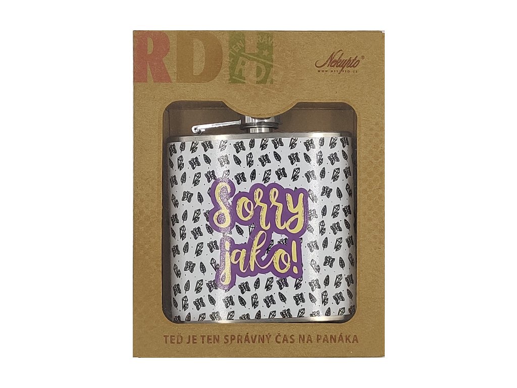 Boříme stereotypy! Proč by i dáma nemohla chodit do víru velkoměsta s placatkou? To, co jí doposud chybělo v kabelce, je stylová placatka s vtipným textem „Sorry jako!“. S touto nerezovou placatkou ji nic nerozhází. Jde totiž o její záložní plán!