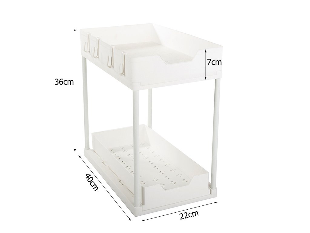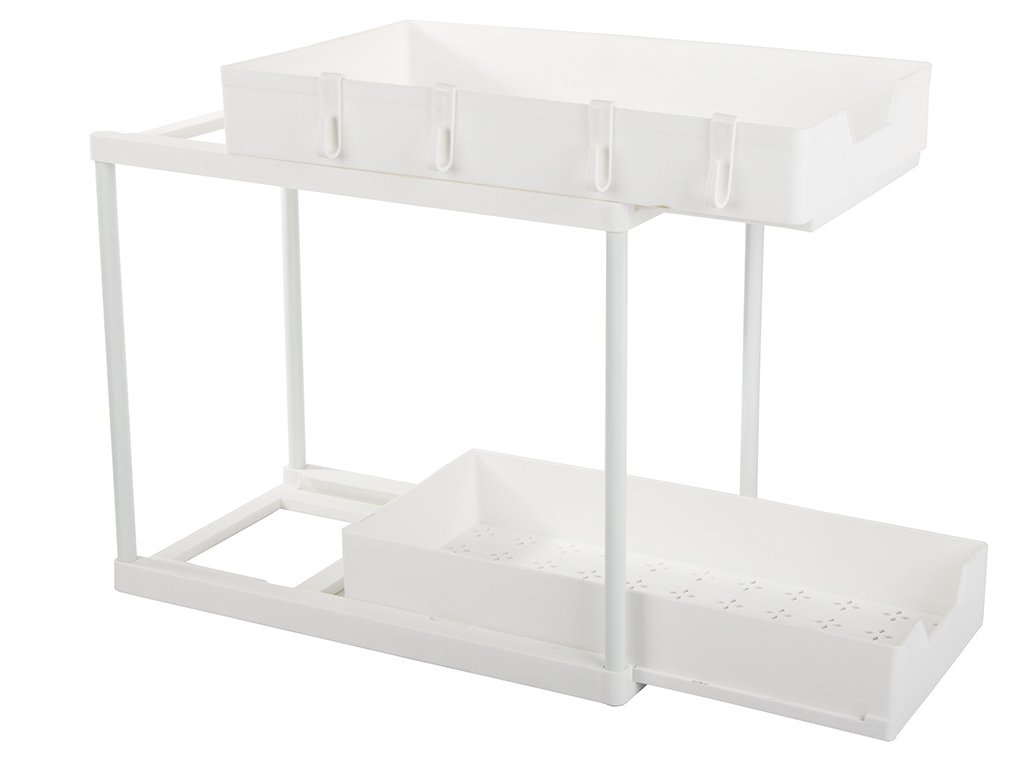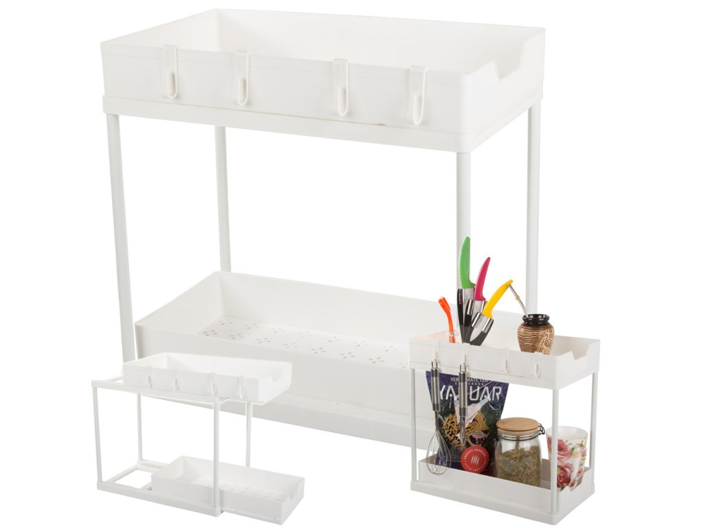 Je vybaven dvěma výsuvnými policemi, které umožňují snadný přístup k uloženým produktům a šetří místo na pracovní desce nebo ve skříňce.