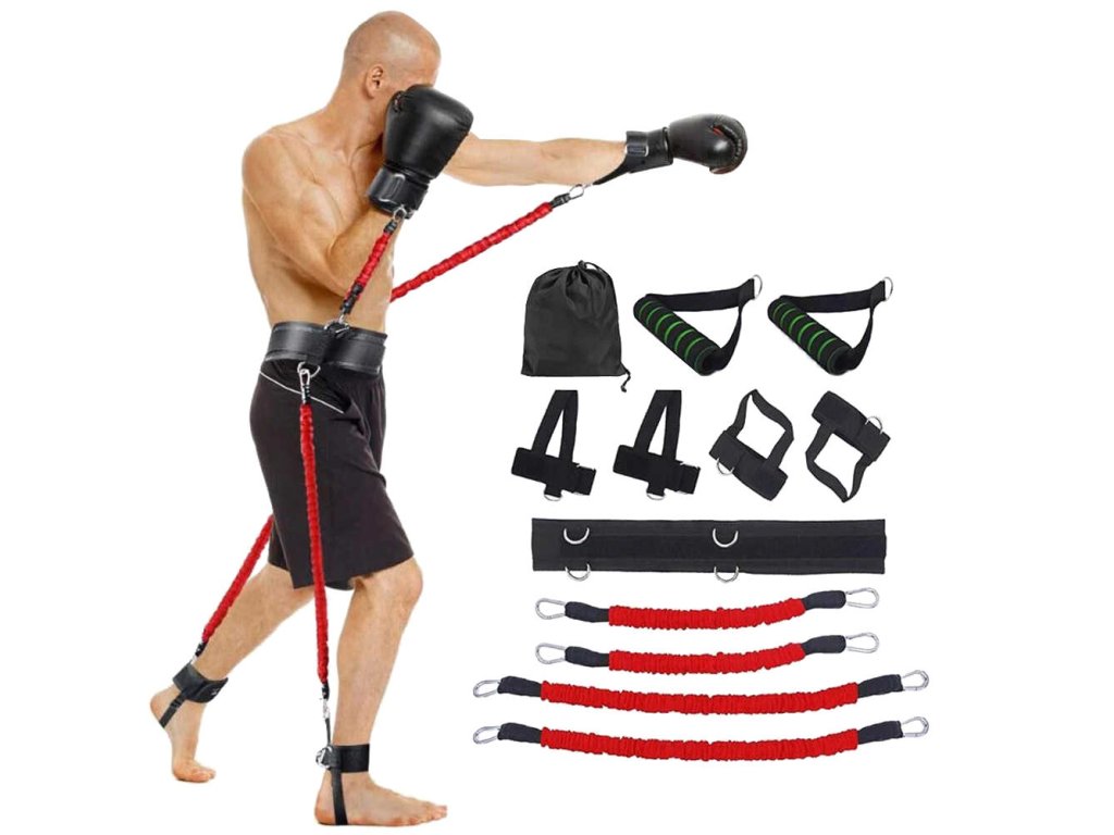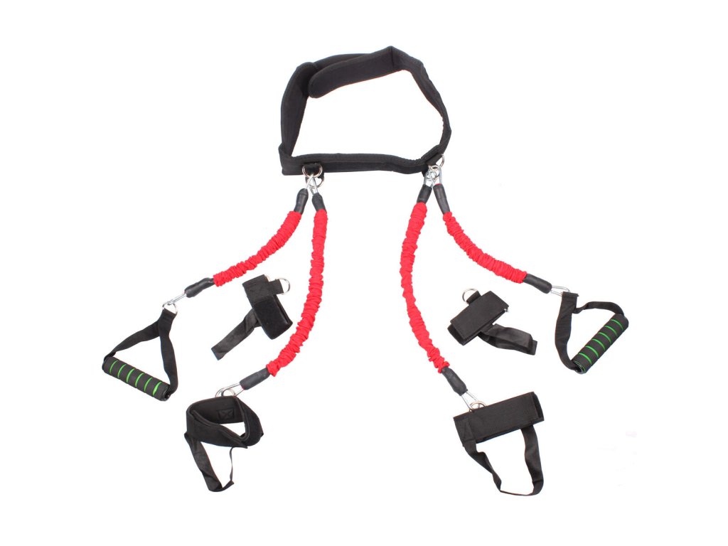 Posilovací sada odporových gum Boxing Band Set je určená pro efektivní trénink boxerů a zápasníků. Všestranný rozvoj ovšem zařídí i pro další sportovní odvětví. Ať se jedná o fotbal, hokej, volejbal nebo fitness, tyto expandery značně ztíží váš trénink a vy tak můžete své výkony posouvat opět dále. Součástí balení jsou celkem čtyři expandery dvou velikostí, 2 úchyty na dolní končetiny, 2 úchyty na horní končetiny, 2 rukojetě a bederní pás pro kompletní upevnění expanderů. Pás i úchyty jsou na suchý zip, a proto si je můžete individuálně nastavit podle potřeby. Pomocí této tréninkové pomůcky odcvičíte celé tělo, nebo se můžete soustředit jen na jednotlivé svalové partie. Pomůcka je vhodná pro muže i ženy. Vybrat si můžete z několika barevných provedení a zátěží. Zelené a žluté odporové gumy odpovídají celkovému odporu 45 kg a modré s červenými 55 kg odporu. Délka expanderů: 35 cm a 25 cm Součást balení: 4x expander, 4x manžeta pro uchycení, 2x rukojeť, 1x bederní pás, stahovací sáčekDoplňkové parametry