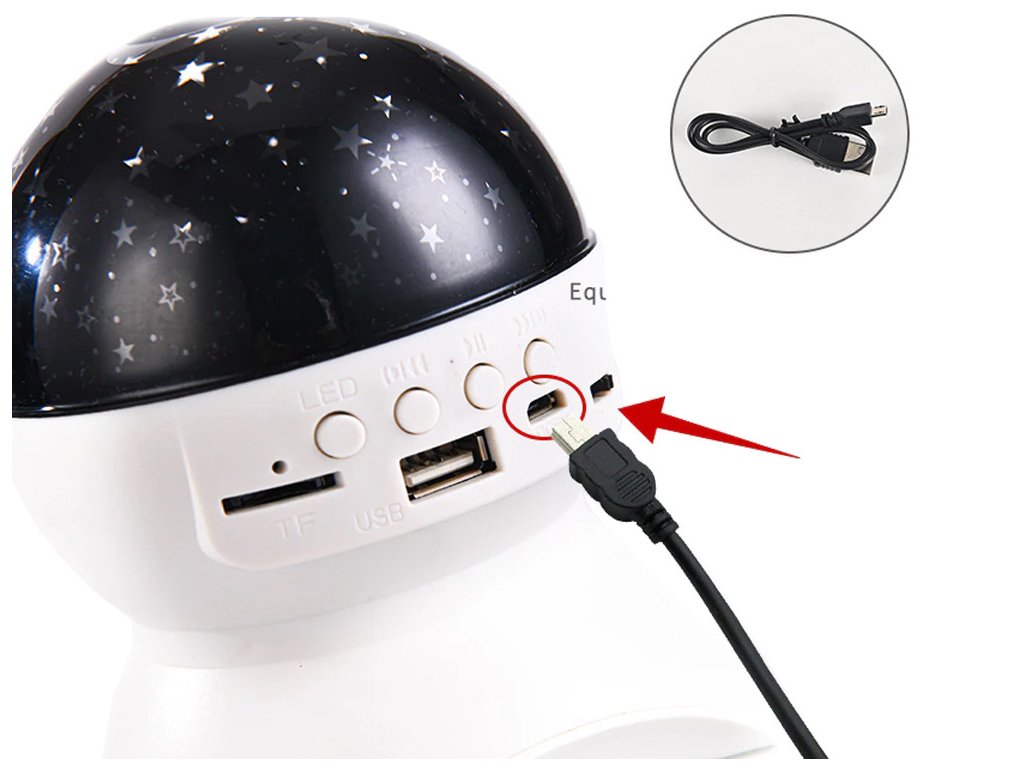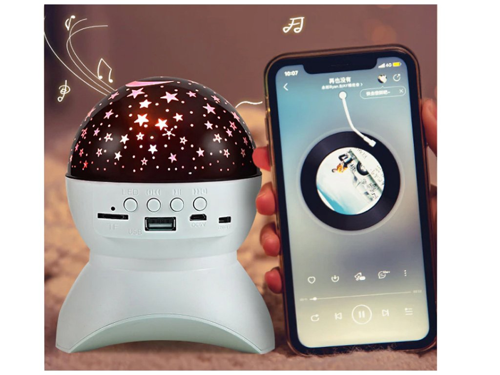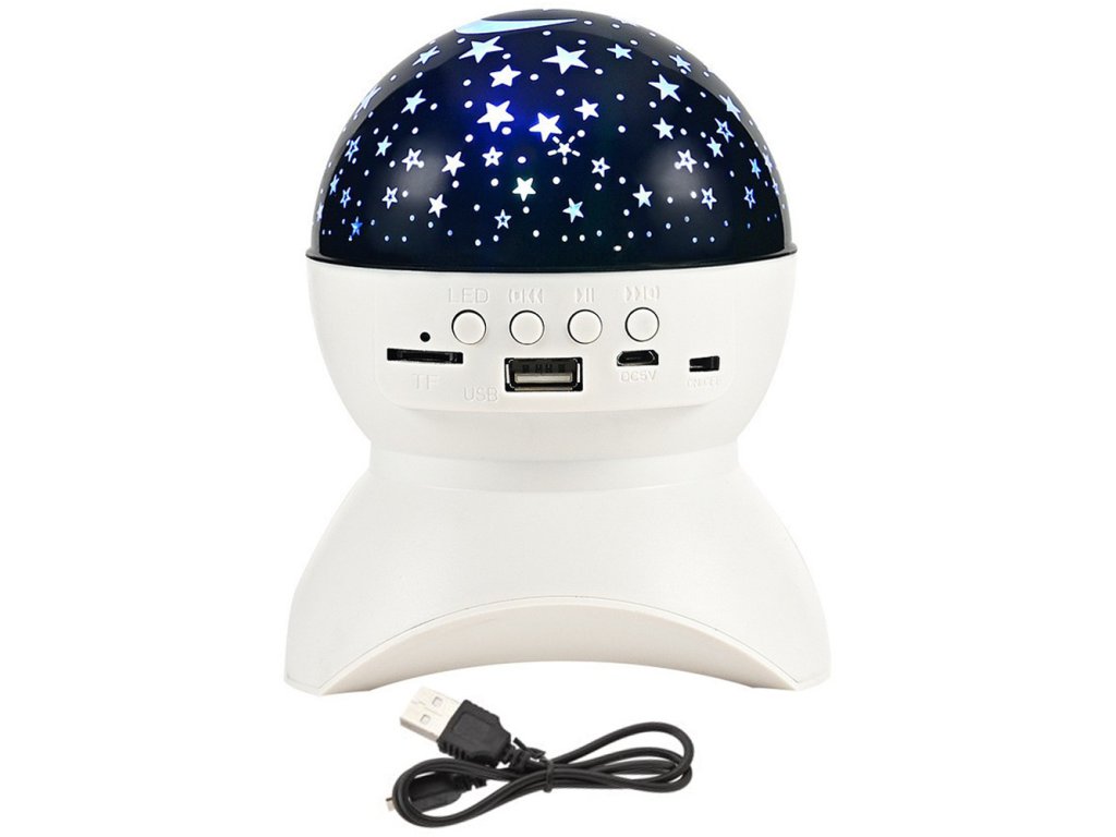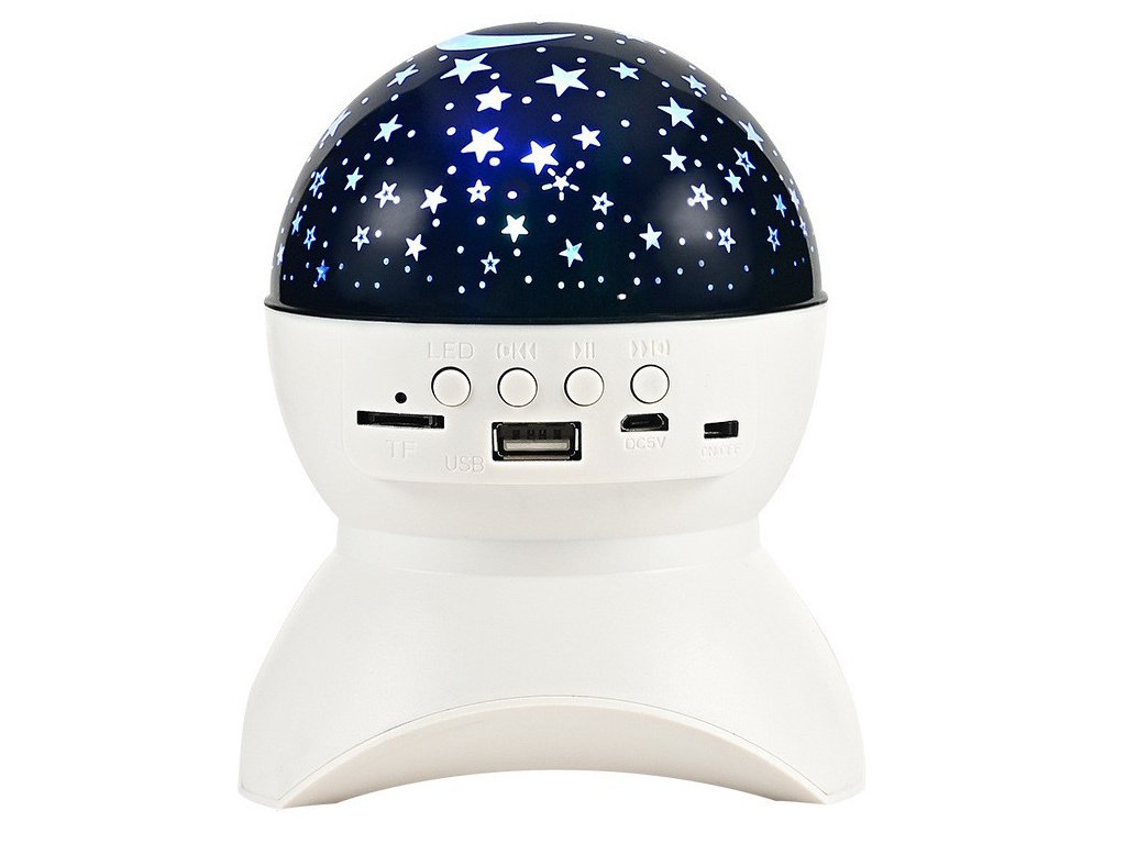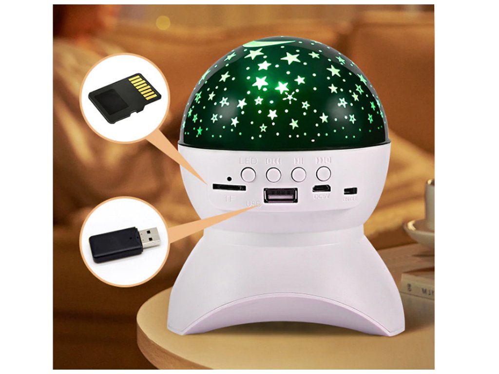 Projektor má vstup pro kartu micro SD, USB, vstup pro nabíjení DC 5V a Bluetooth. Můžete tedy přehrávat hudbu z paměťové karty i z telefonu. Reproduktor v tomto malém zařízení je opravdu hlasitý. Zařízení je ideální pro malé děti, kterým můžete před spaním vytvořit krásnou atmosféru hvězdné oblohy přehráním jejich oblíbené ukolébavky nebo pohádky na dobrou noc.