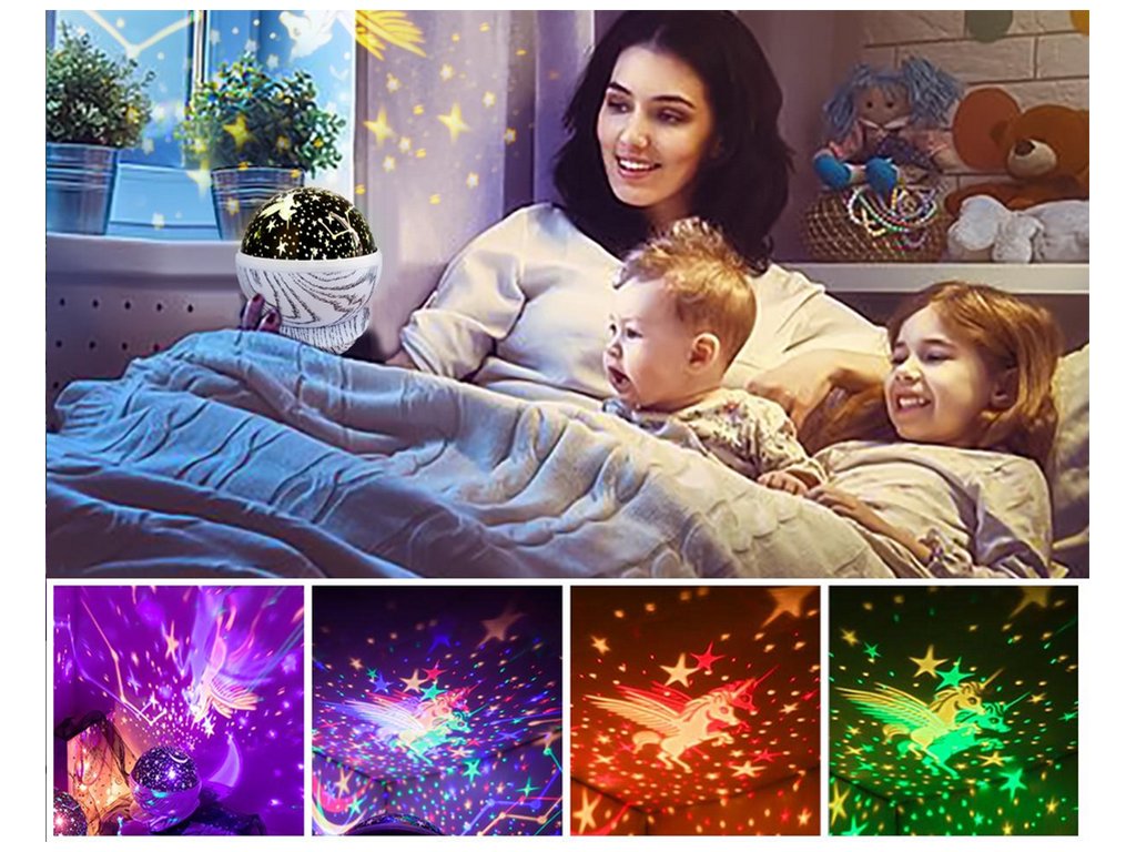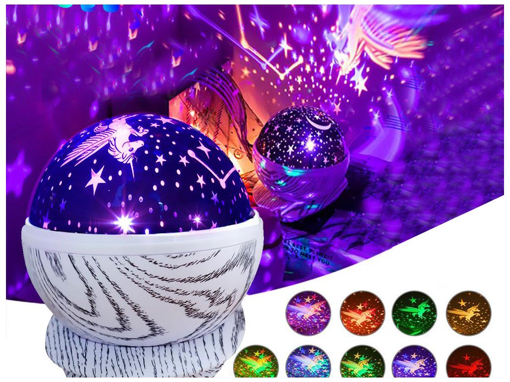 Lampa vytváří úžasné obrazce na stěnách a oknech. Dokonale reprodukuje hvězdnou oblohu bez mráčku spolu s létajícím jednorožcem.