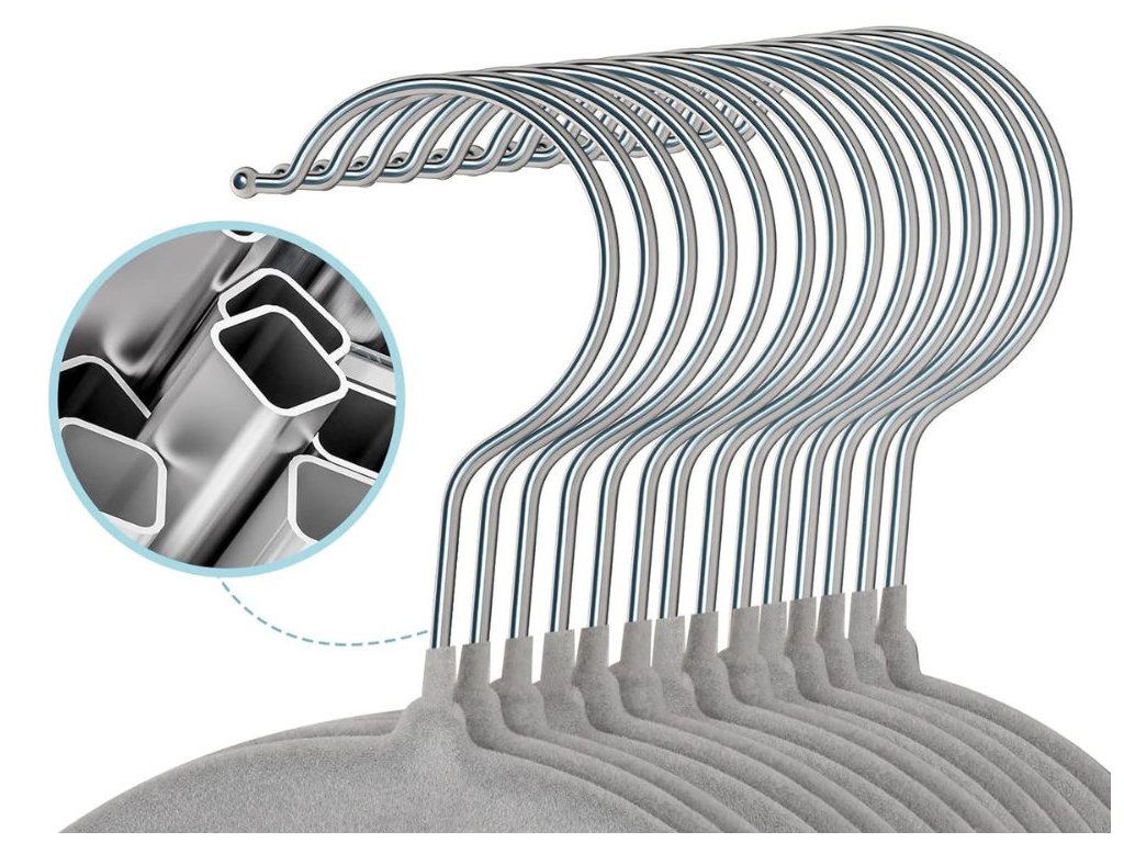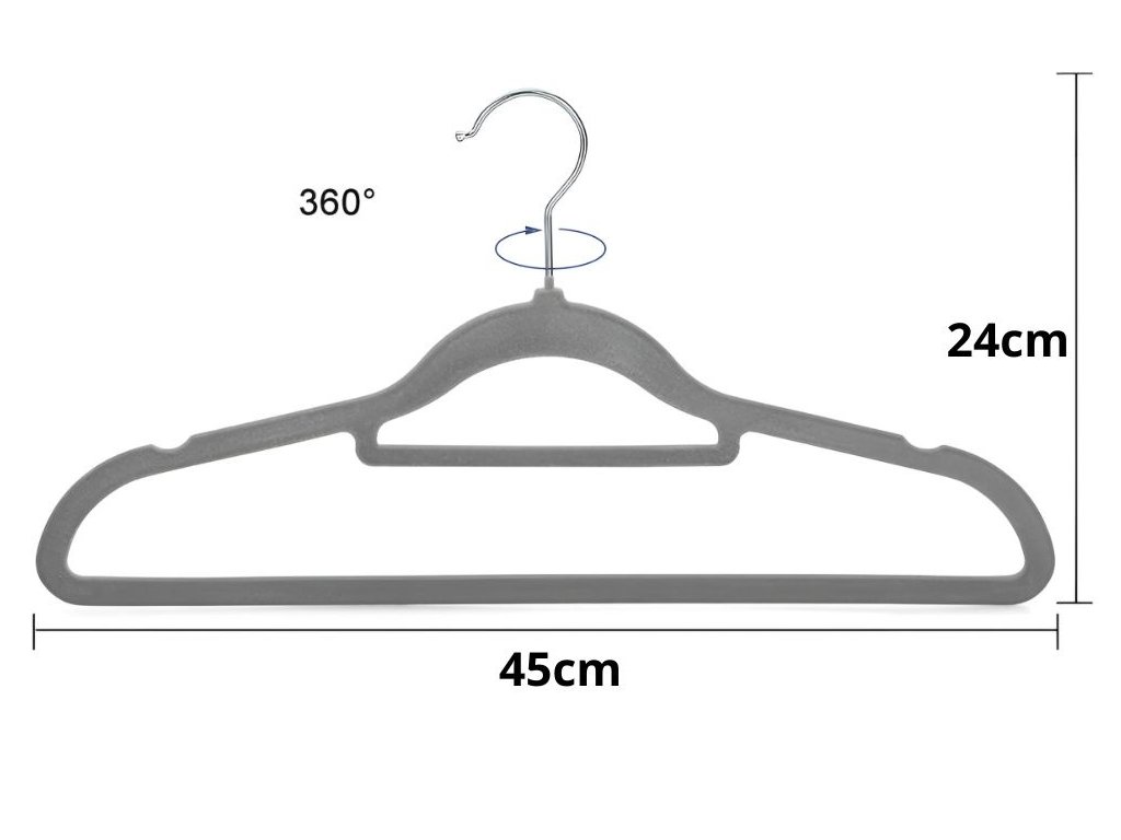 Každé ramínko je vybaveno robustním kovovým háčkem, který se otáčí o 360°, a usnadňuje tak věšení oblečení v jakémkoli směru. Díky velurovému potahu zůstanou na svém místě i hedvábné halenky, šaty nebo košile. Další výřezy po stranách umožňují zavěšení ramínek, což z něj činí velmi univerzální řešení.