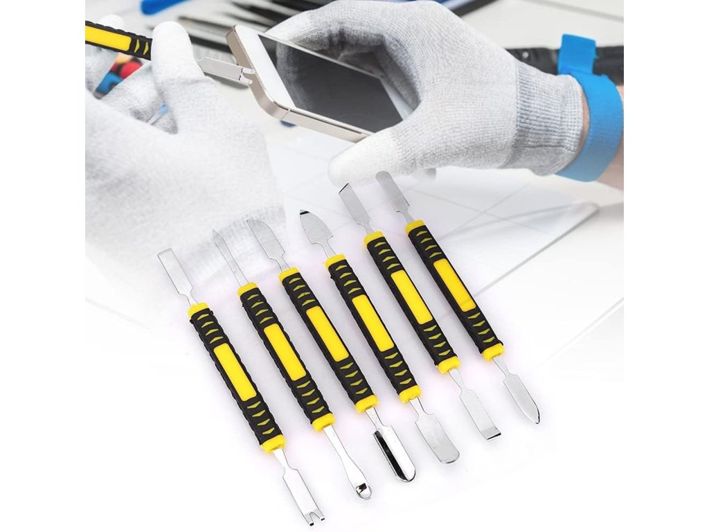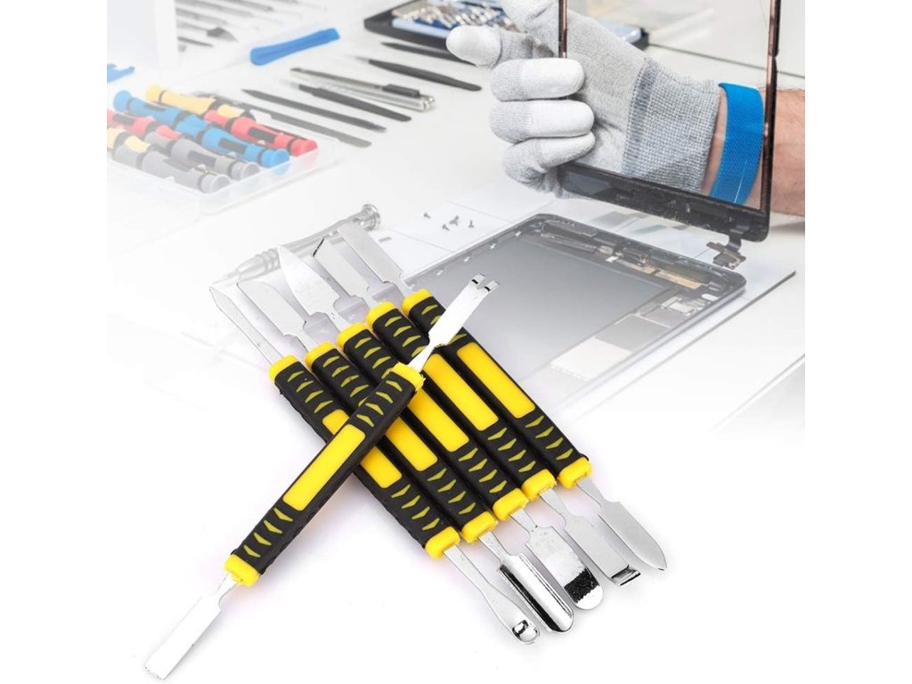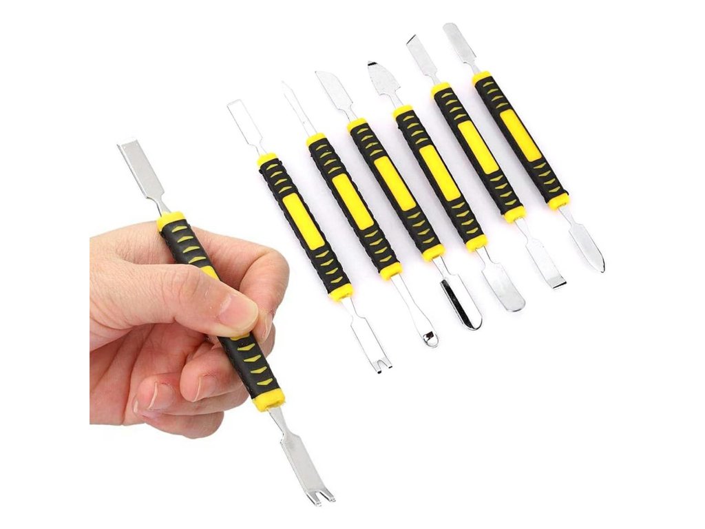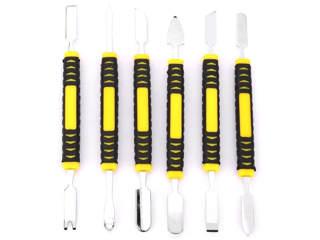Sada šesti nástrojů/otvíráků pro vypáčení elektronických součástek. Je ideální pro servisní práce, kde je vyžadována velká přesnost. Ideální pro otevírání krytů různých zařízení. Dlouhé a pohodlné rukojeti každého nářadí usnadňují práci a zaručují pevný úchop. Každý nástroj má dva hroty, což vám dává až 12 různých nástrojů (škrabky, háčky a škrabadla).