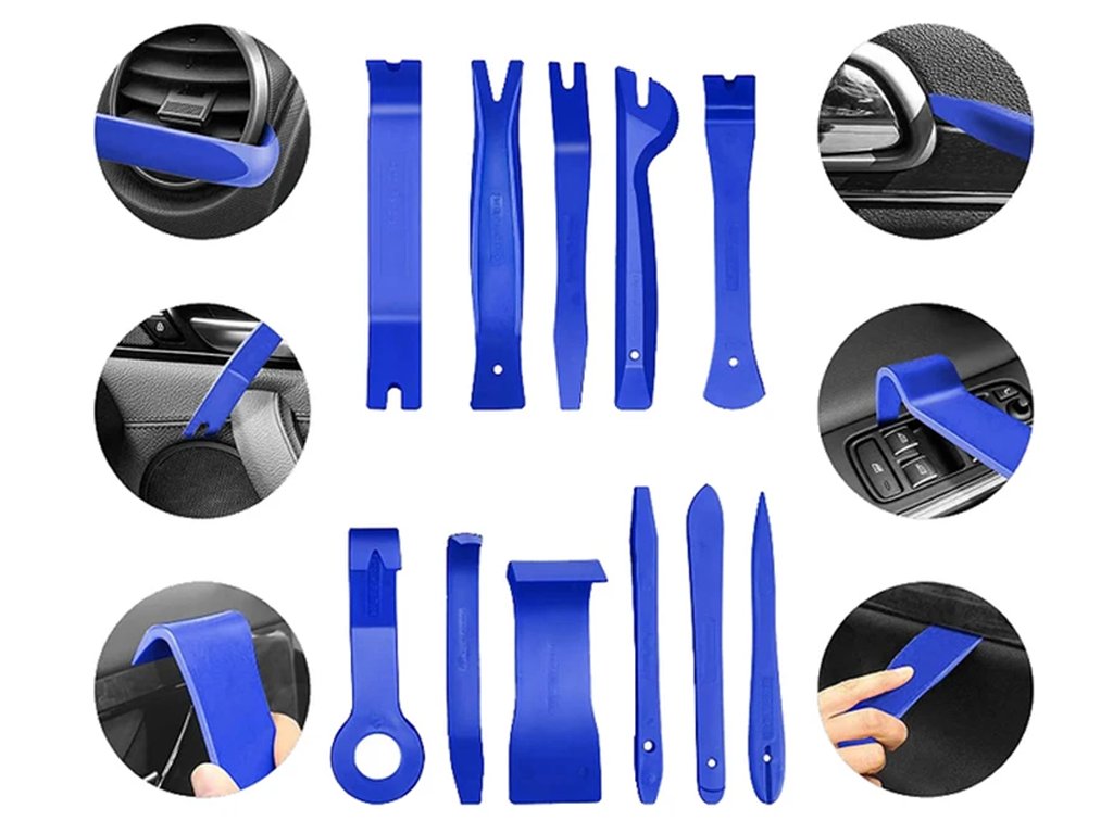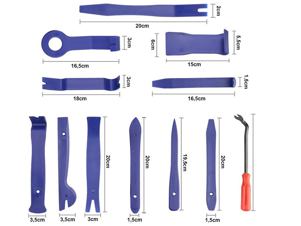 Tyto stahováky jsou ideální pro odstraňování plastových dílů v interiérech našich vozů. Díky jejich různé tloušťce je můžeme použít k odstranění větracích otvorů, klik dveří, rádia atd. Hroty nástrojů nejsou ostré, takže se nemusíme obávat poškrábání částí našeho vozu.
