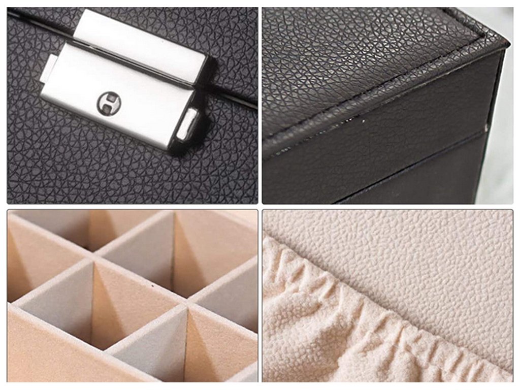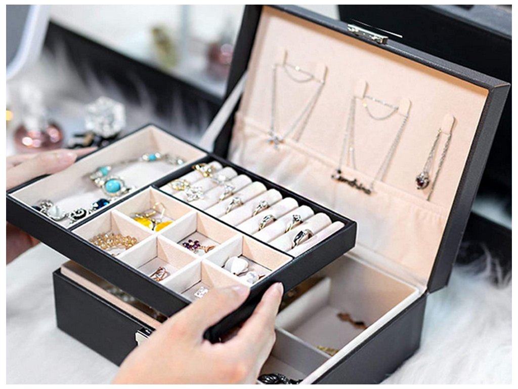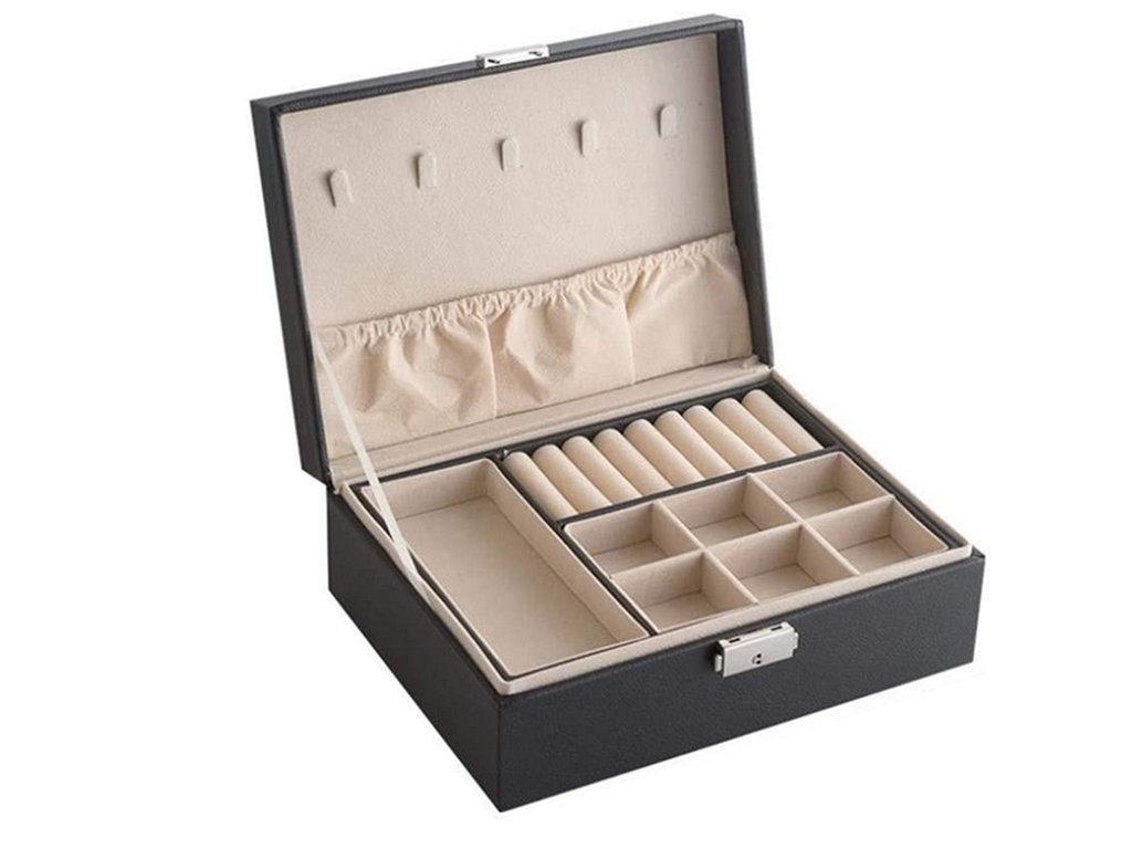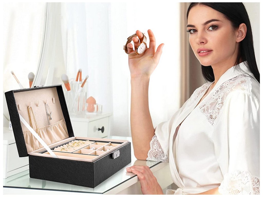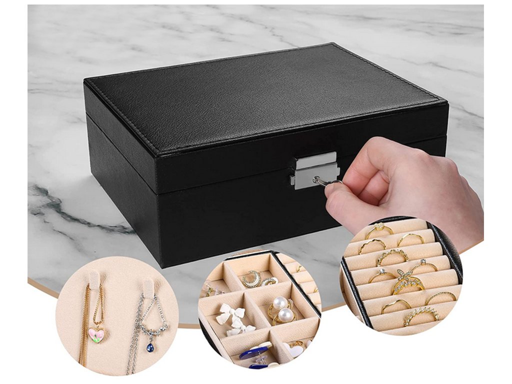 Velká, velmi prostorná schránka pro uspořádání všech typů šperků a hodinek. Organizér je vybaven různými typy a velikostmi přihrádek , které úspěšně pojmou velké množství prstenů, řetízků, náušnic, náramků atd.