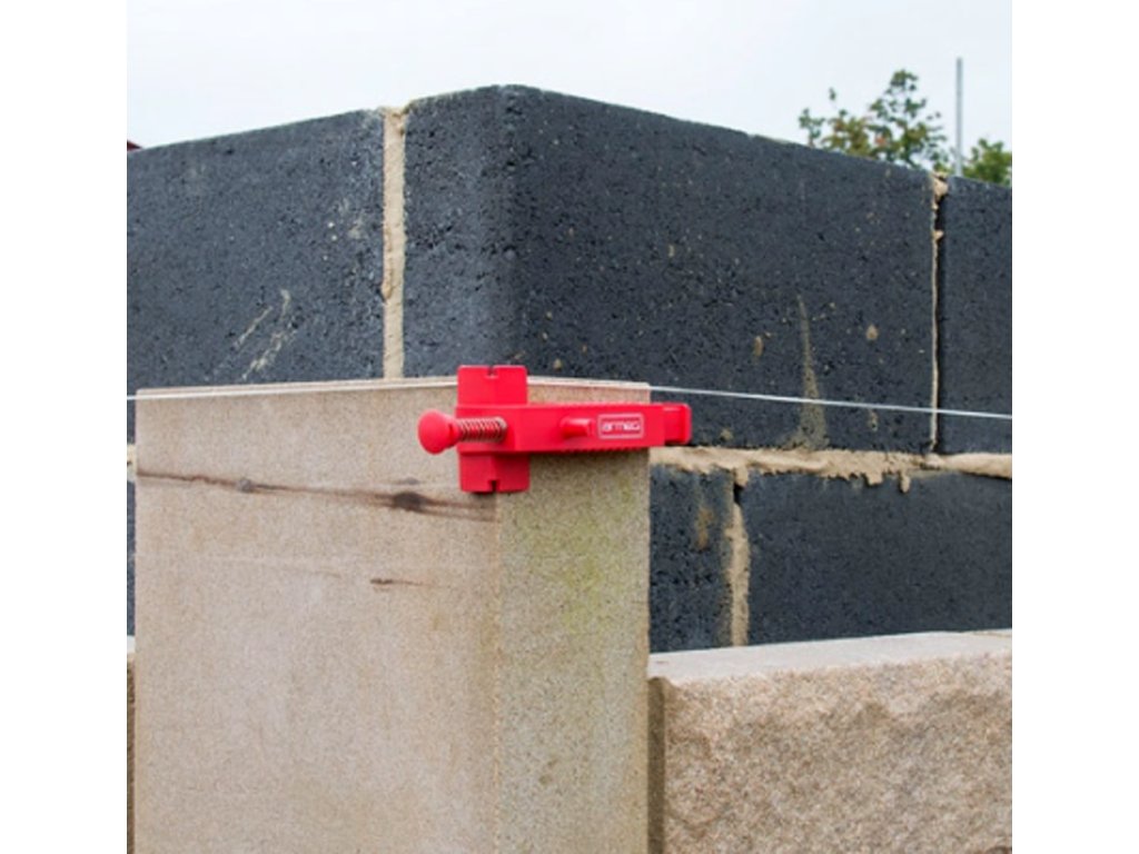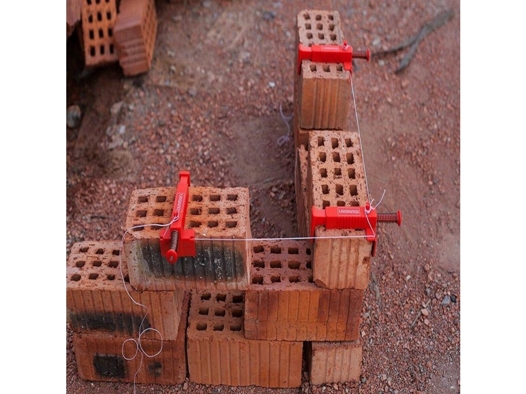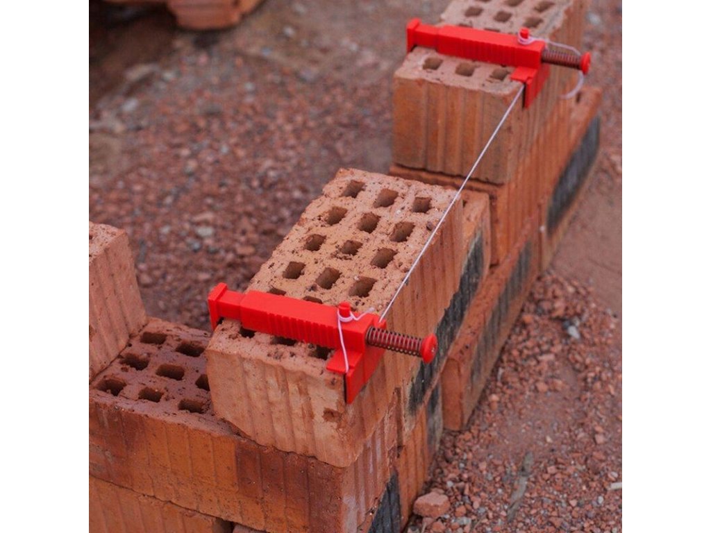Návod: Svorky upevněte na dvě koncové cihly a připevněte na ně provázek tak, aby byl zcela natažený. Dále se při přidávání dalších cihel řiďte výškou provázku, aby řada cihel zůstala zcela v rovině.