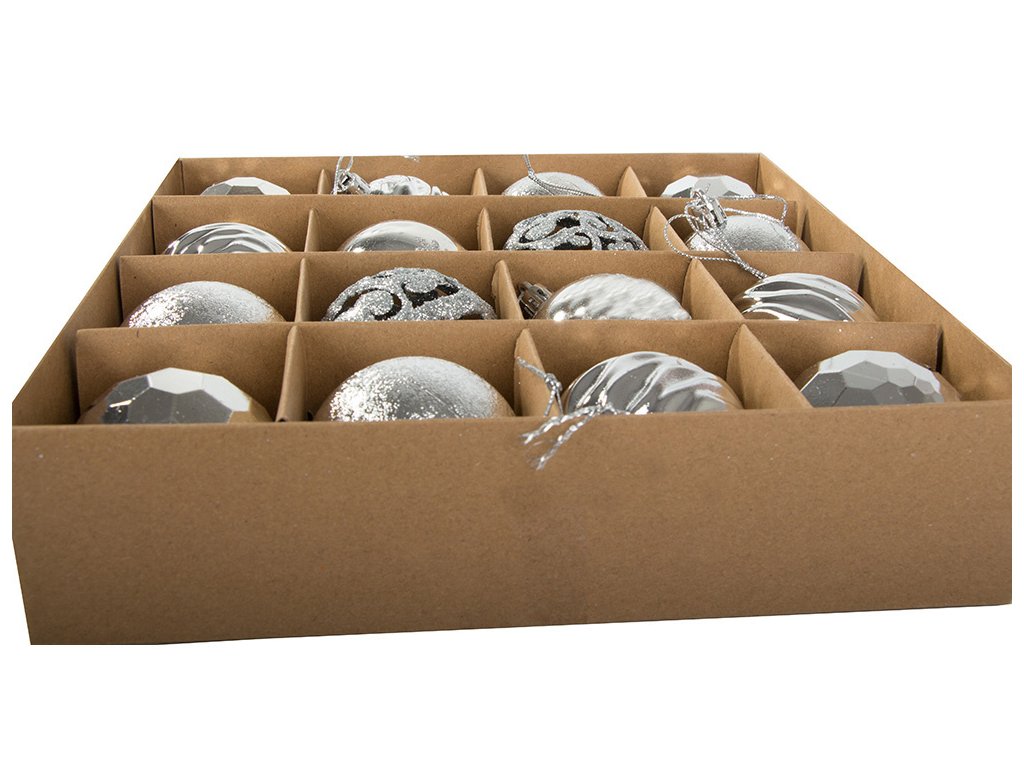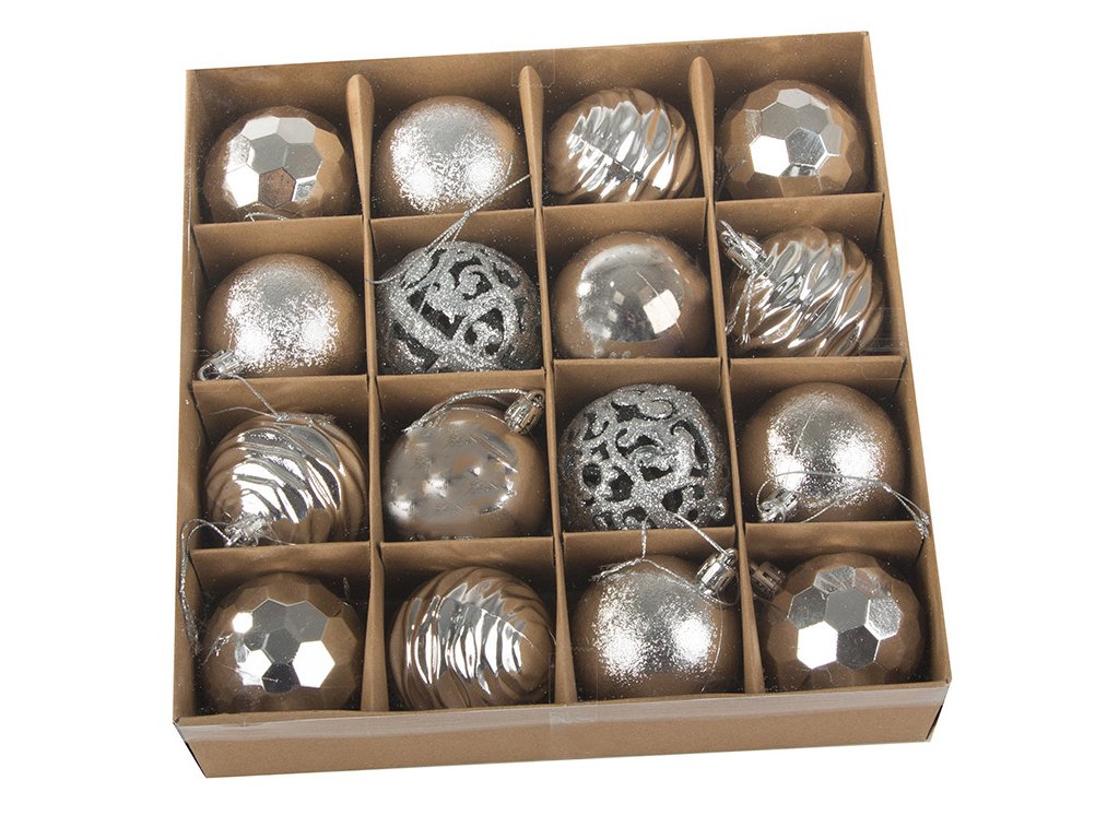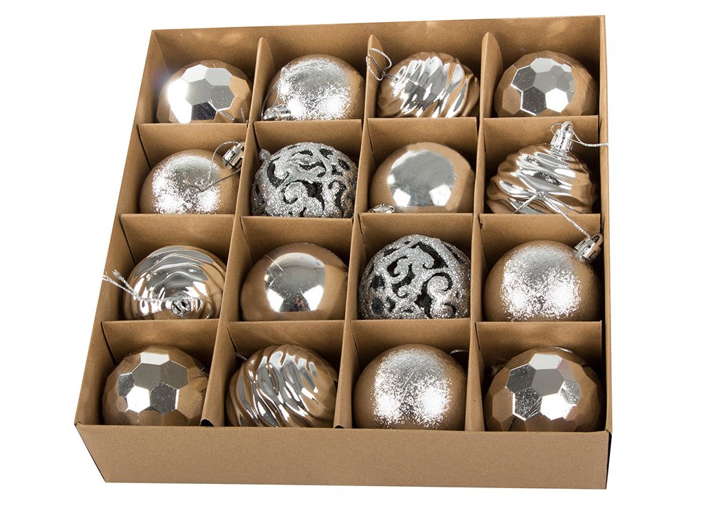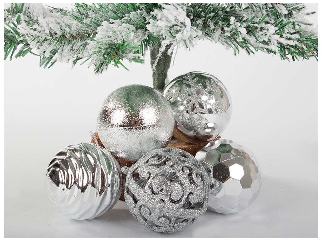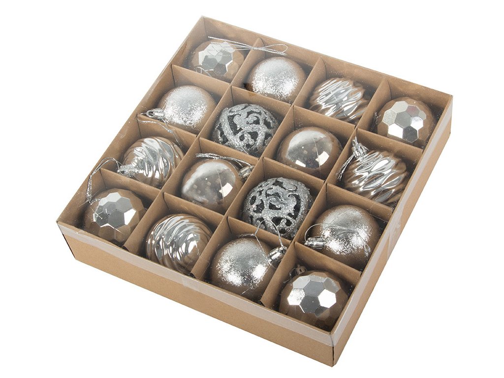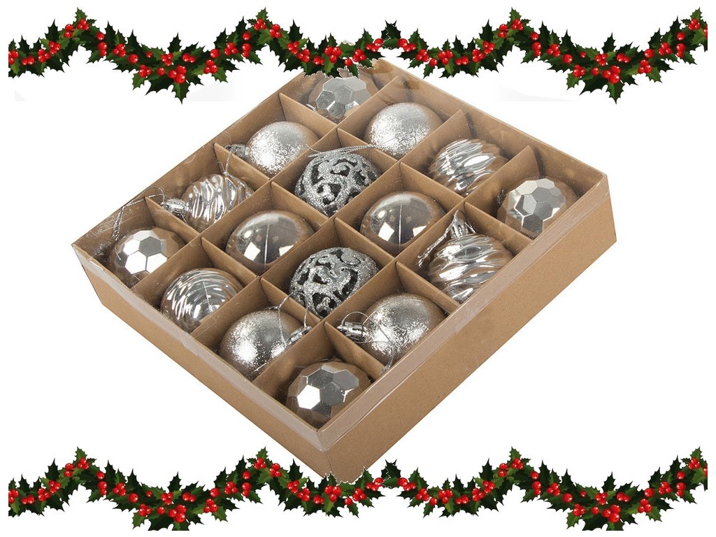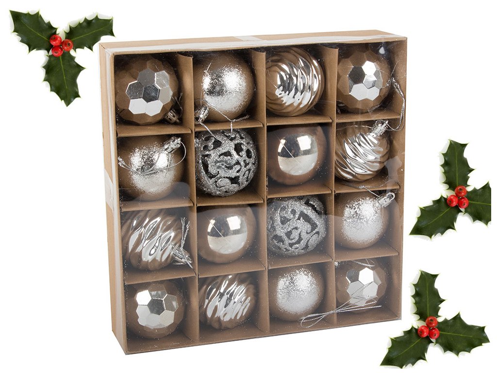 Vánoční stromeček a ozdoby jsou nepostradatelnými prvky vánoční atmosféry. Ozdoby zavěšené na zelených větvičkách naplňují interiér kouzlem Vánoc. Sada 16 ozdob v pěti vzorech.