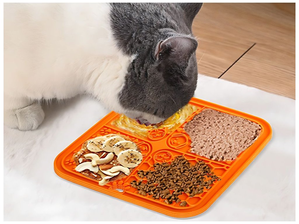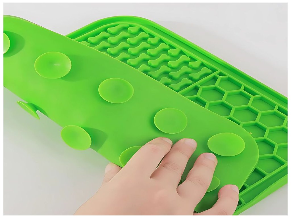 Podložka je vyrobena z vysoce kvalitního potravinářského silikonu, je bezpečná pro zdraví domácích mazlíčků, netoxická, pružná a velmi snadno se čistí - stačí ji opláchnout vodou nebo vložit do myčky. Je ideální pro servírování vlhkého krmiva, jogurtu, paštik, past nebo arašídového másla. Díky přísavkám na zadní straně ji lze připevnit k podlaze, stěně nebo vaně, což zabraňuje jejímu pohybu během používání.
