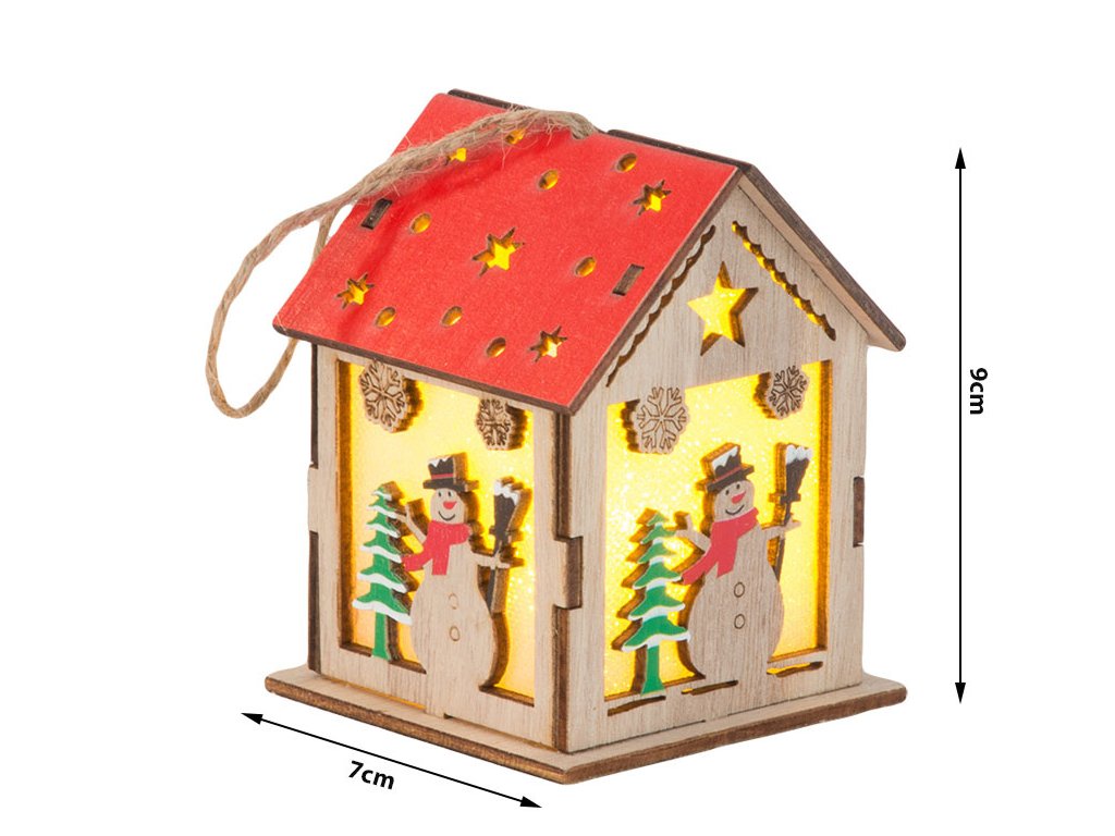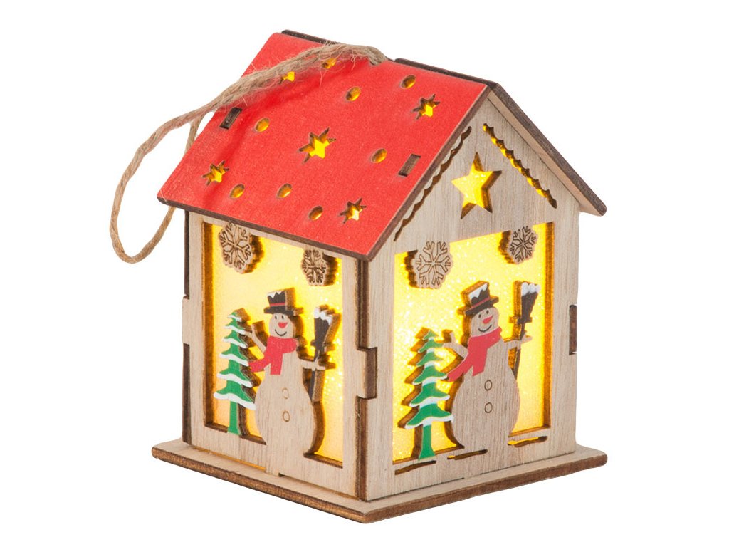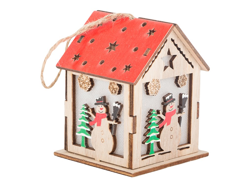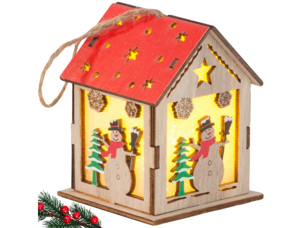 Lucernaje vyrobena z přírodního dřeva a je opatřena jemnými výřezy ve tvaru hvězd a svátečními motivy, jako je sněhulák a vánoční stromek. Uvnitř se nachází LED osvětlení, které decentně osvětluje dekoraci a vytváří hřejivou, útulnou atmosféru.