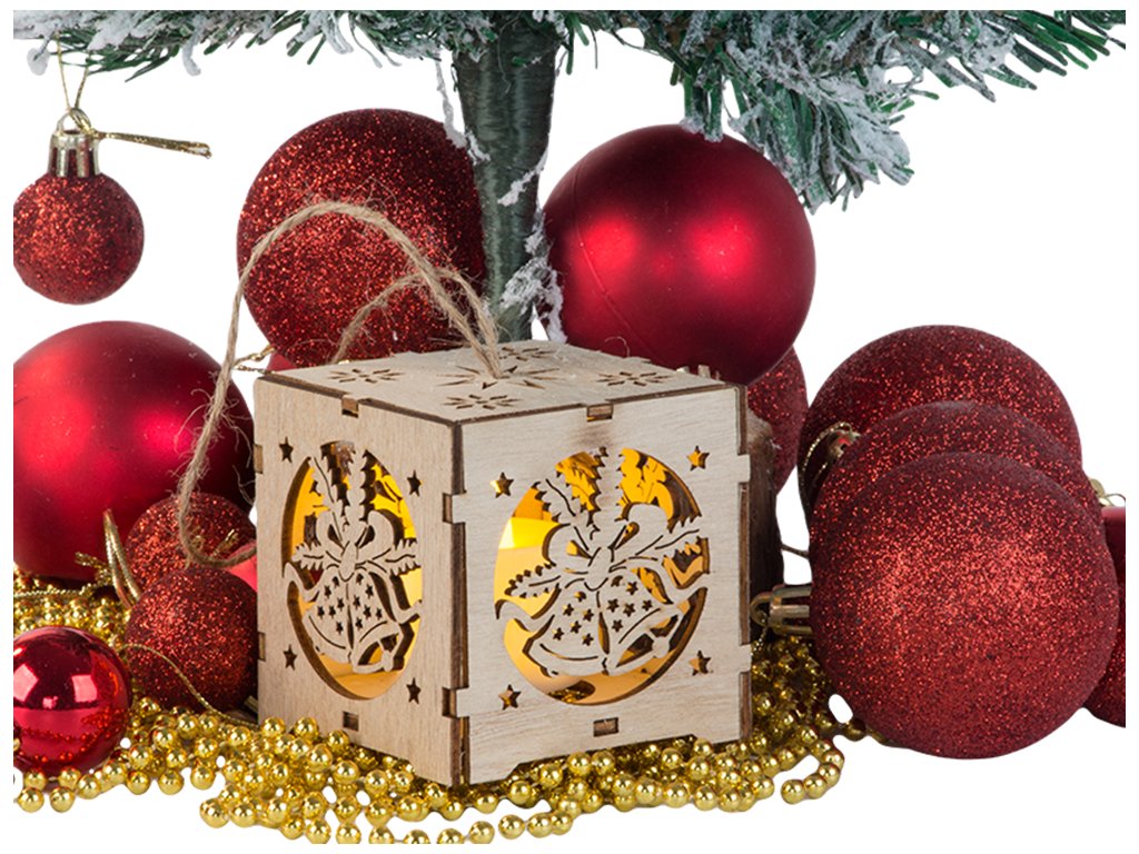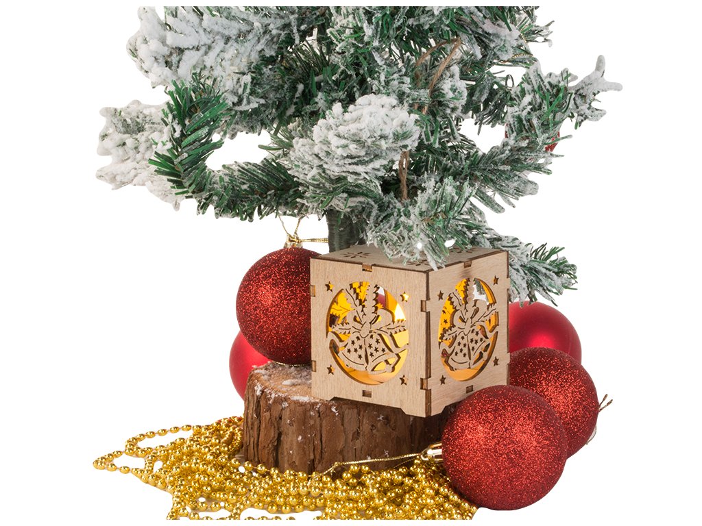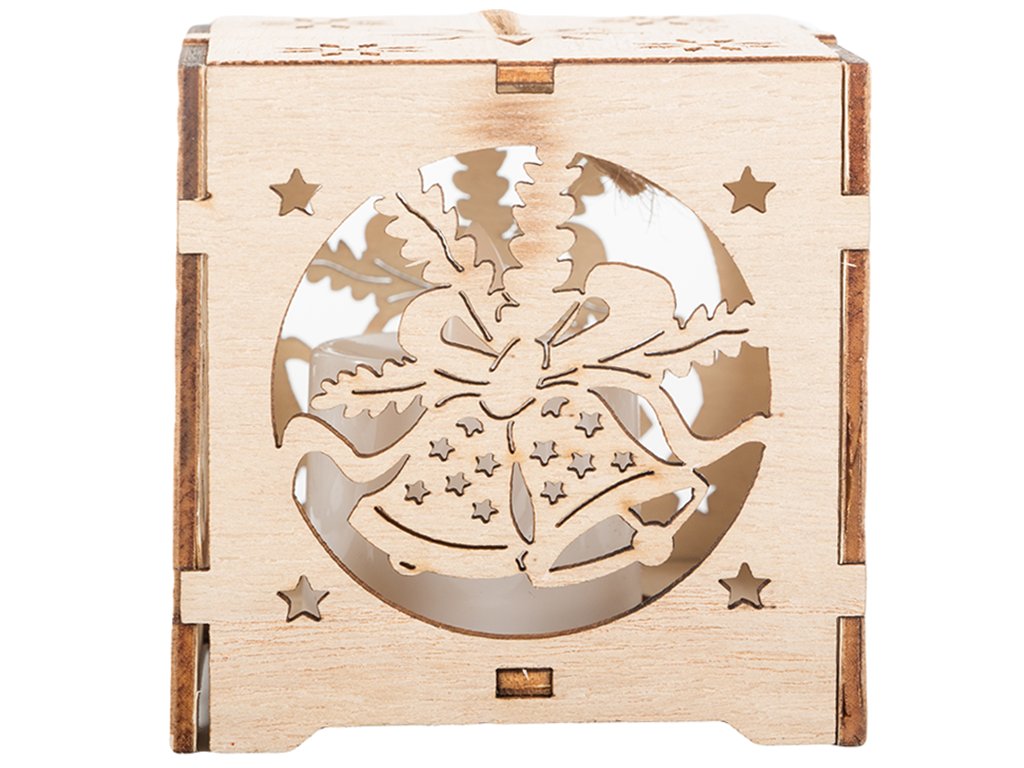 Lucernaje vyrobena z přírodního dřeva a je opatřena jemnými výřezy ve tvaru hvězd a svátečními motivy, jako jsou vánoční zvonky. Uvnitř se nachází LED osvětlení, které decentně osvětluje dekoraci a vytváří hřejivou, útulnou atmosféru.