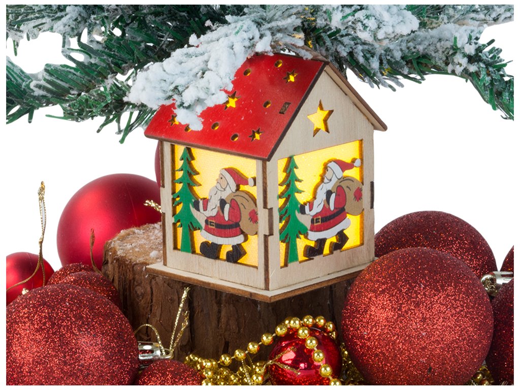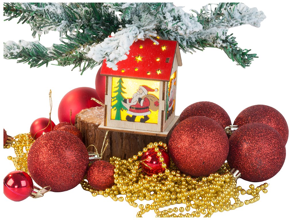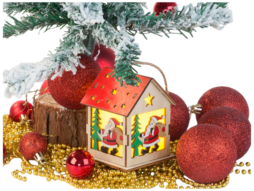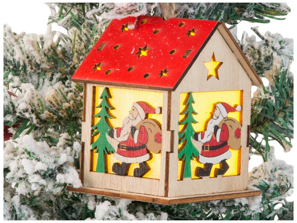 Lucernaje vyrobena z přírodního dřeva a je opatřena jemnými výřezy ve tvaru hvězd a svátečními motivy, jako je Santa Claus a vánoční stromek. Uvnitř se nachází LED osvětlení, které decentně osvětluje dekoraci a vytváří hřejivou, útulnou atmosféru.