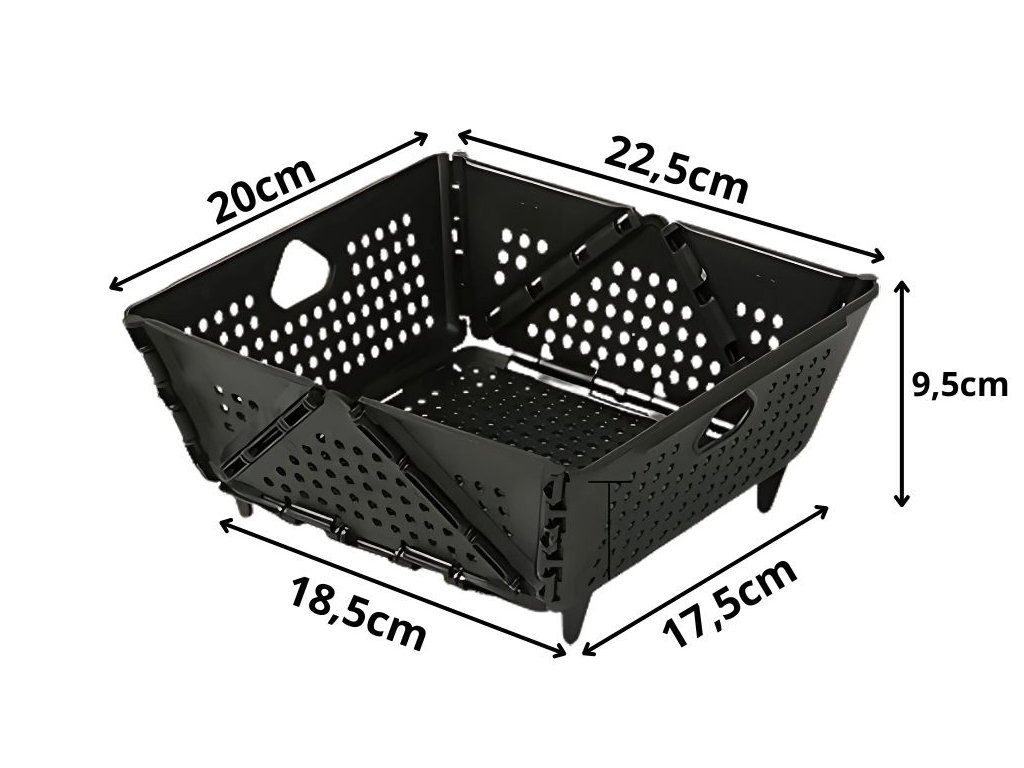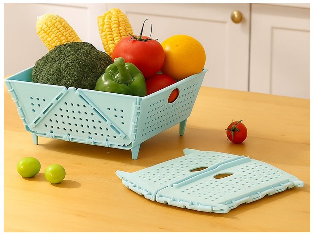Skládací košík – cedník je funkční doplněk, který se hodí do každé kuchyně. Může sloužit jako servírovací podnos, organizér na skladování a cedník na mytí ovoce a zeleniny. Díky skládací konstrukci zabírá málo místa ve skříňce a jeho univerzální design se hodí do každého interiéru. Ideální pro každodenní použití doma, ale i na pikniky nebo grilování.