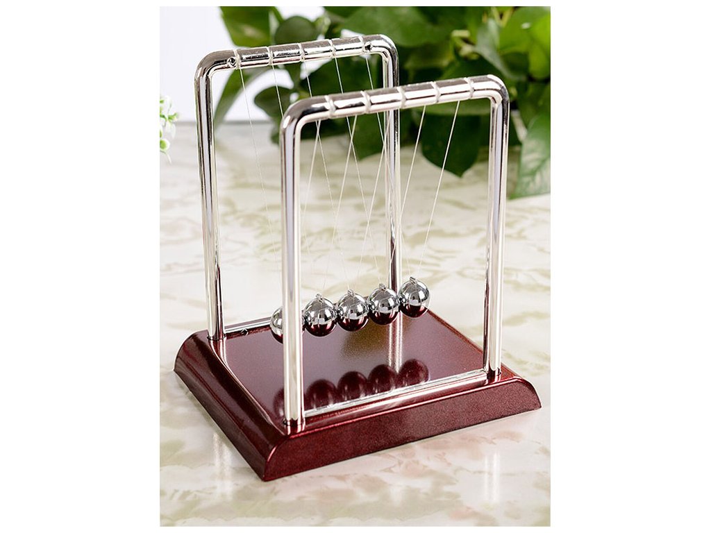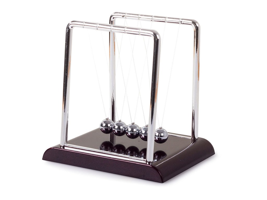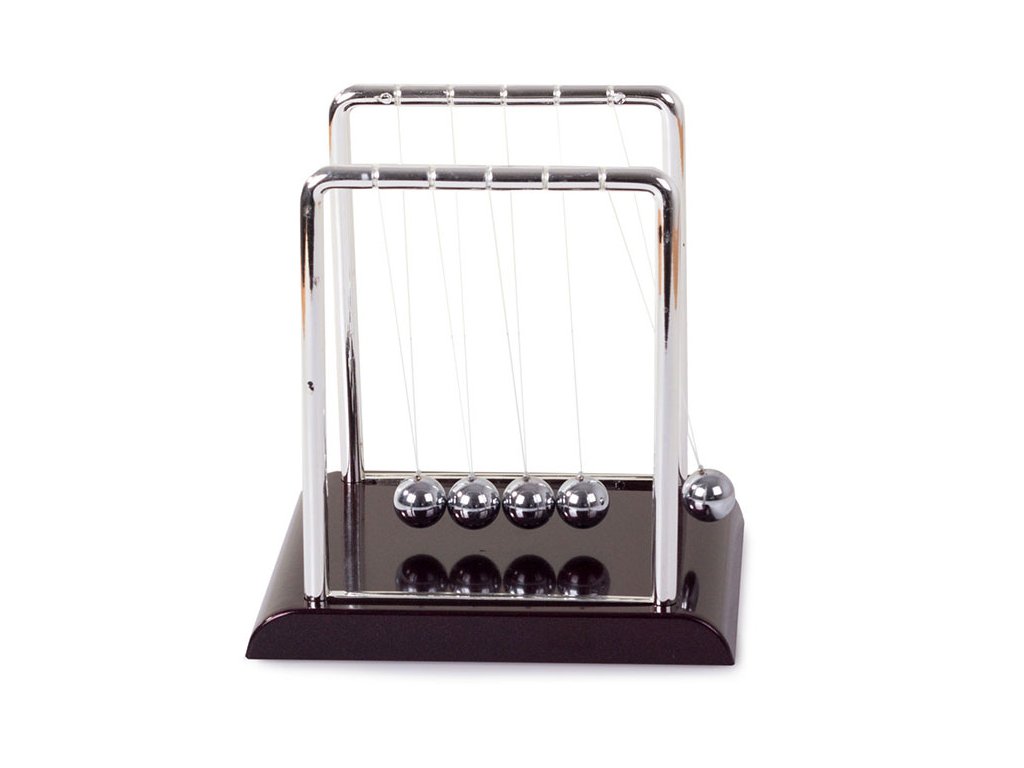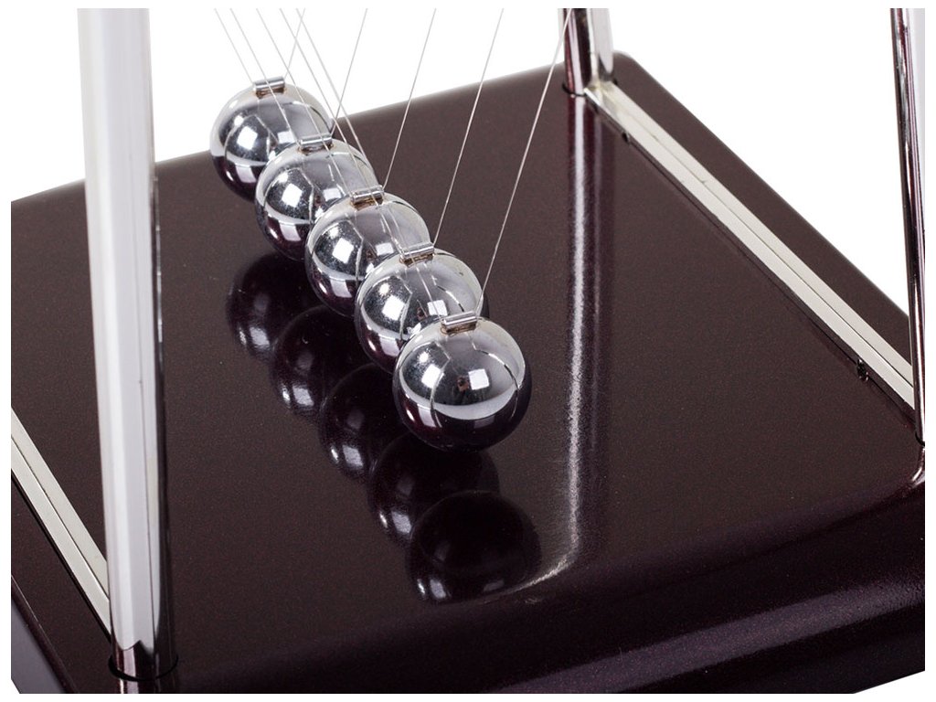 Když jednu kuličku přitáhneme a pustíme, narazí do ostatních a poslední kulička se odrazí zpět do téměř stejné výšky. Je to proto, že srážky míčků jsou pružné a jejich kinetická energie a hybnost se zachovávají.