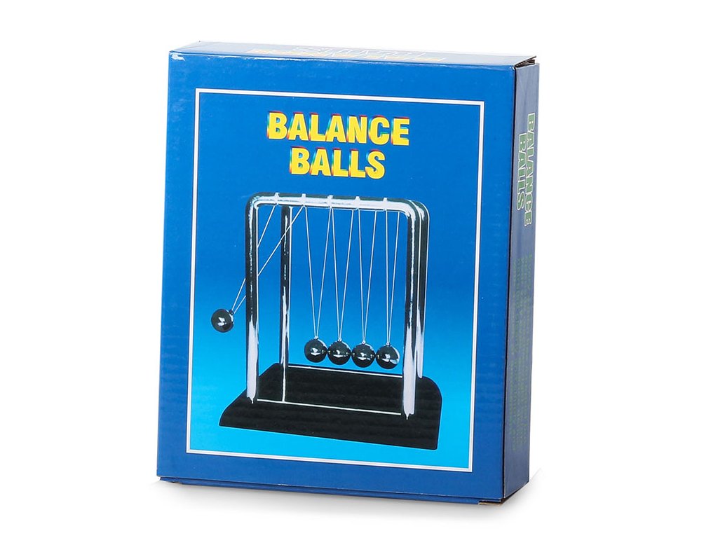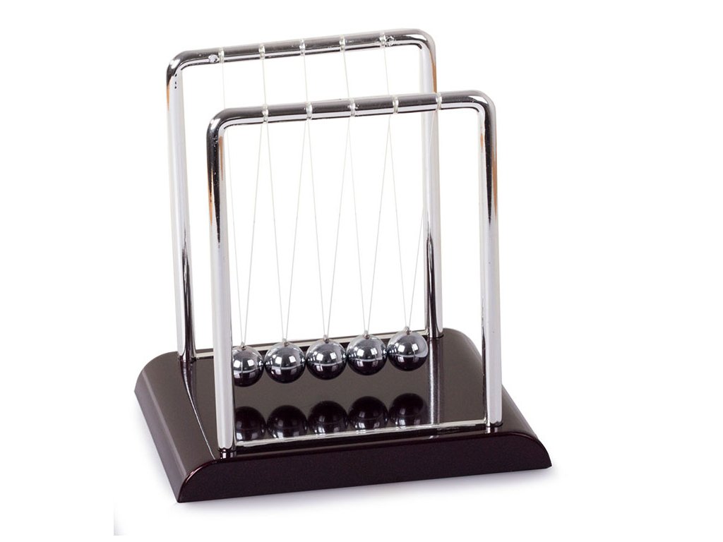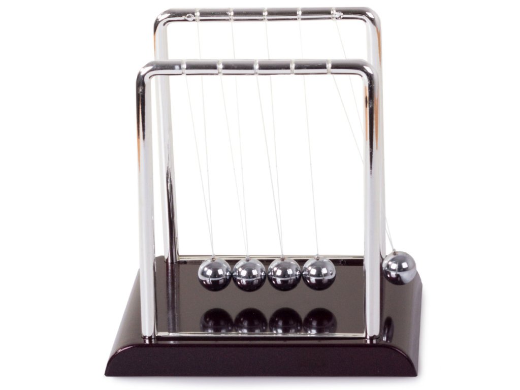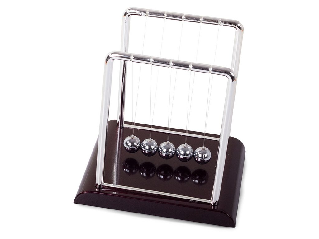 Když jednu kuličku přitáhneme a pustíme, narazí do ostatních a poslední kulička se odrazí zpět do téměř stejné výšky. Je to proto, že srážky míčků jsou pružné a jejich kinetická energie a hybnost se zachovávají.